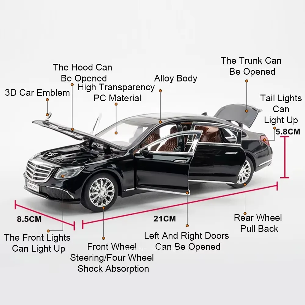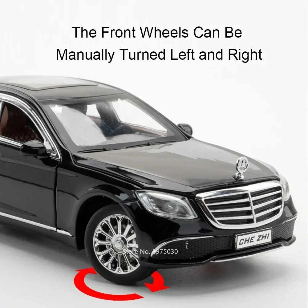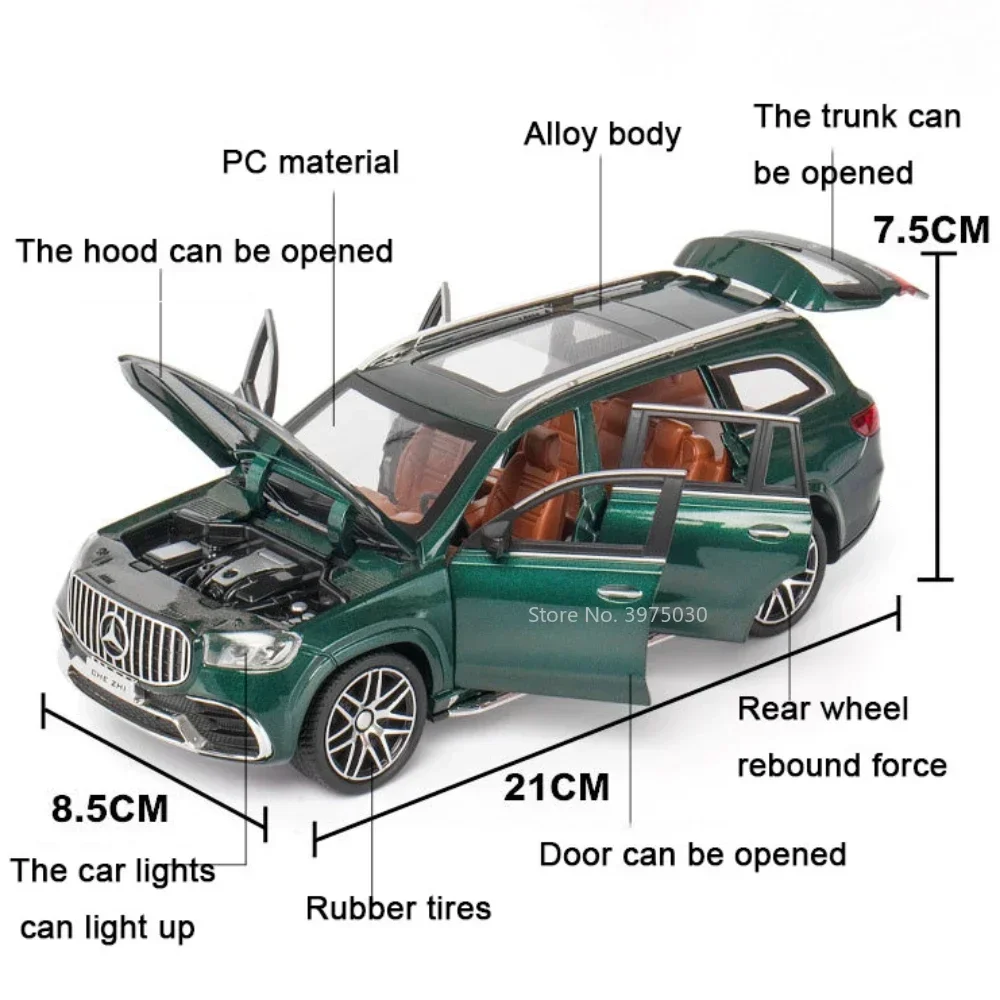 Imagine owning a meticulously crafted replica of the luxury Mercedes-Benz GLS63 or E300eL, designed to captivate with its high-level realism and exquisite detailing. Made from durable zinc alloy, this model features a sleek metallic finish, smooth contours, and aerodynamic lines that exude sophistication. The front grille with chrome slats, illuminated headlights, detailed side mirrors, and textured rubber tires contribute to its lifelike appearance. Open the doors to showcase the intricate interior, or activate the sound and light functions to bring the model to life. Perfect for collectors and enthusiasts, this compact yet highly detailed replica enhances any display with its impressive craftsmanship and authentic design.