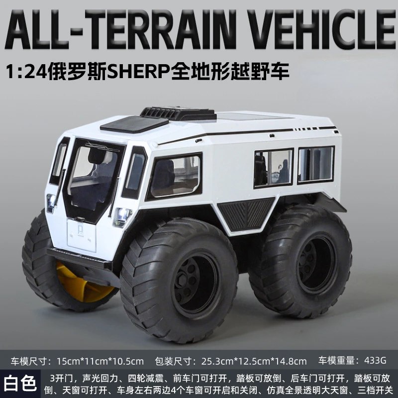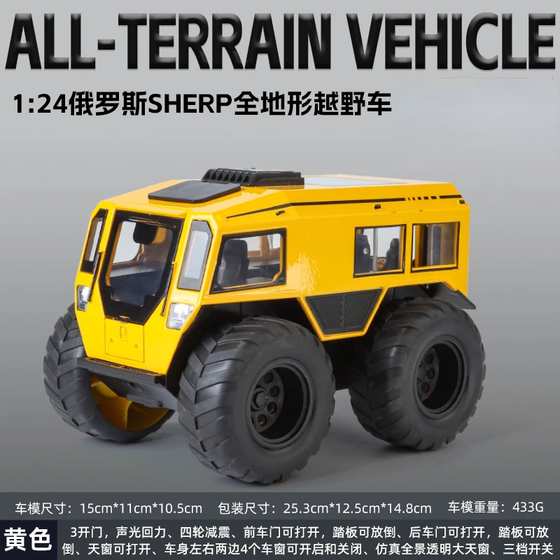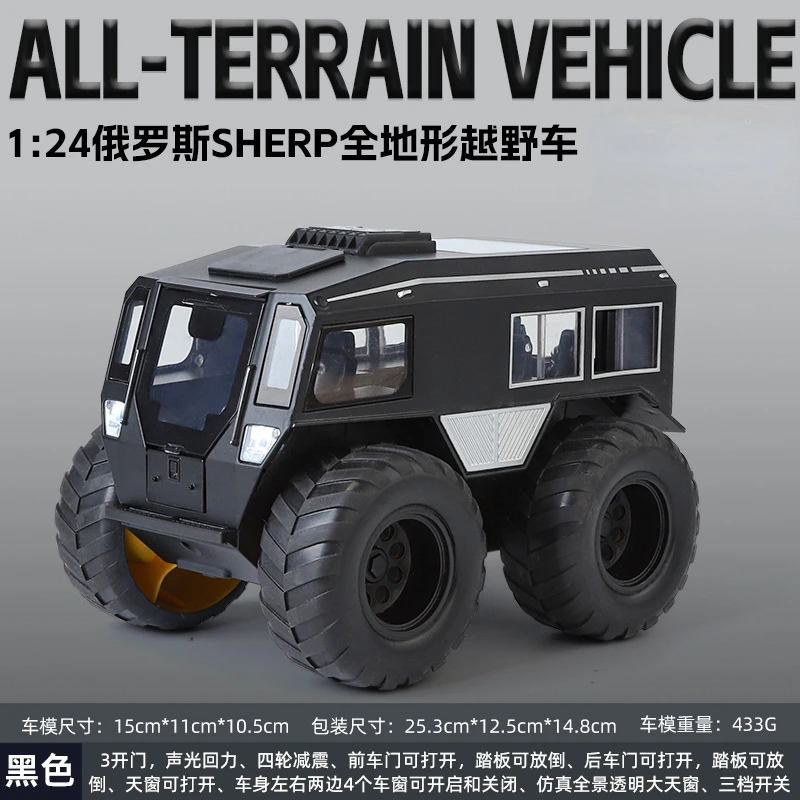 Experience the rugged realism of this 1:24 scale diecast all-terrain off-road vehicle, crafted from alloy metal with a shiny, durable finish. Featuring a sleek black body, sharp angular design, oversized tires with deep treads, and transparent glass panels, this model captures the essence of heavy-duty off-road machines. Equipped with sound and light effects, it offers an engaging display piece or collectible. Available in various color options—black, white, yellow—with or without display boxes—this non-electric model requires no batteries and is suitable for enthusiasts aged 14 and up, making it an ideal gift for collectors and off-road vehicle fans alike.