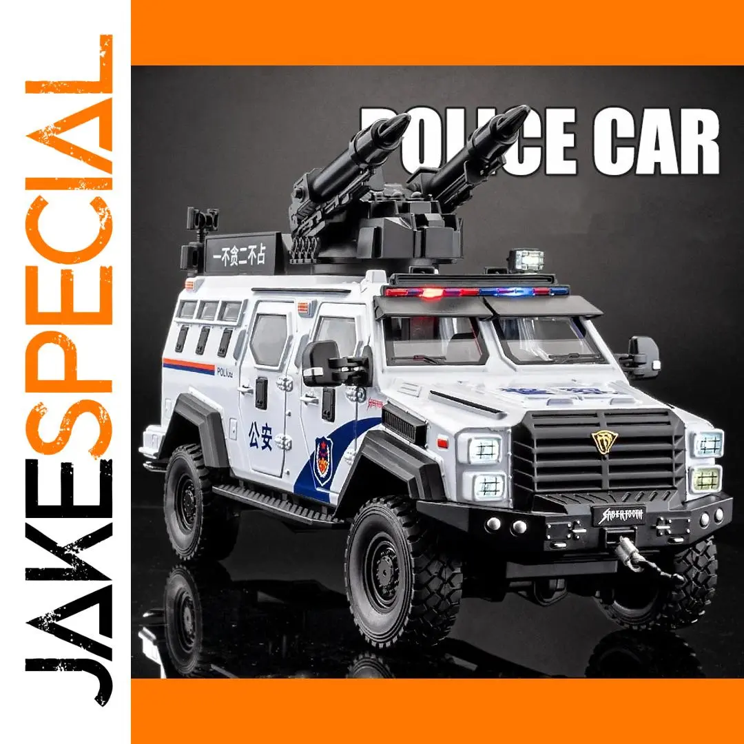 Imagine adding this impressive 1:24 scale diecast alloy toy vehicle to your collection or display. With its rugged, military-inspired design, this model showcases a sleek white body accented by bold police markings, including blue and red stripes, shield icons, and Chinese characters, giving it an authoritative presence. Its detailed textured paneling and reinforced armored look evoke durability and strength. The front features a striking black grille, central emblem, and bright white headlights, complemented by large off-road tires with detailed tread patterns. The roof boasts a realistic, movable dual-barrel turret with black and silver accents, enhancing its tactical appearance. Integrated light and sound features activate flashing police signals, adding to its commanding aesthetic. This meticulously crafted model is perfect for enthusiasts and collectors.