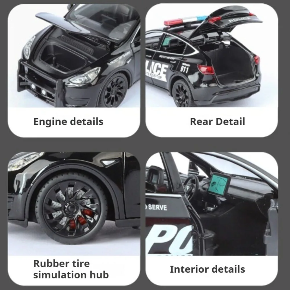 This 1:24 scale diecast police car model features a sleek design with a metal alloy body, plastic chassis, and rubber tires for enhanced durability and realism. Measuring approximately 20 x 8.3 x 7.5 cm for the Model Y and 20.5 x 9 x 7 cm for the Hellcat variant, it includes functional doors, engine hood, and trunk that open, along with pull-back movement and shock-absorbing wheels for smooth operation. Pressing the rear wheel activates authentic sound and light effects, adding to its high-performance appearance. Available in Hellcat Black, Model Y White, and Model Y Black, this model is perfect for collectors and enthusiasts aged 14 and above.