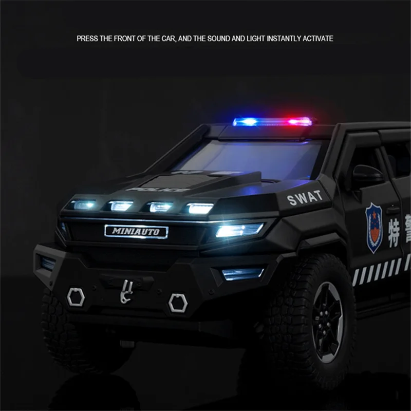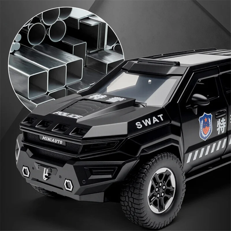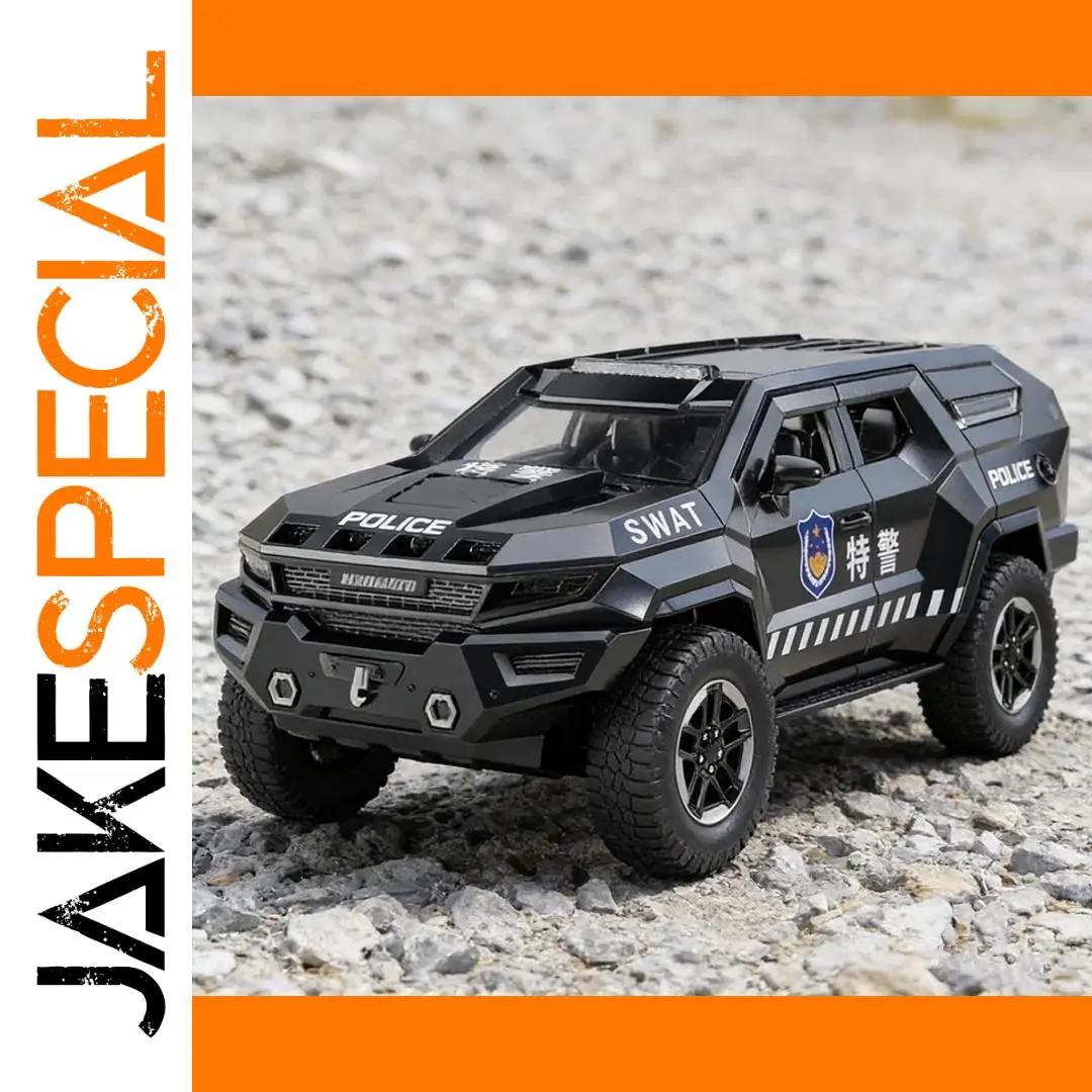 Step into the world of tactical realism with this highly detailed 1:24 scale diecast alloy and plastic police armored off-road vehicle. Its sleek, matte black finish and aggressive geometric design evoke strength and durability. The model features authentic police and SWAT markings, shield emblems, racing stripes, and realistic off-road tires with detailed tread patterns. Equipped with sound and light effects, this model offers an immersive display that captures the essence of tactical military vehicles. Crafted from high-quality materials, this replica is perfect for collectors and enthusiasts who appreciate fine detail and rugged style. Its explosion-proof build enhances its authenticity as a formidable off-road patrol vehicle.