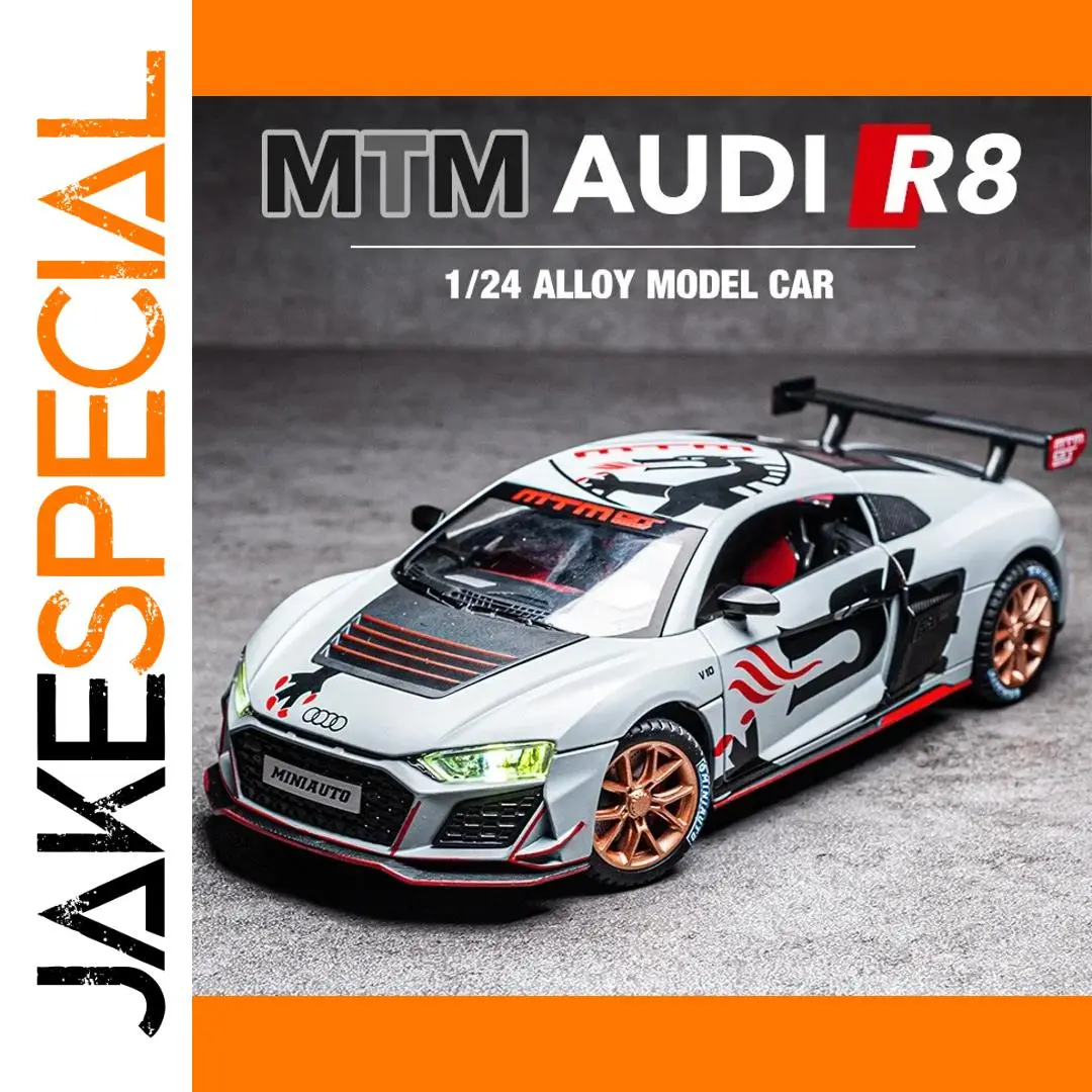 Experience the thrill of racing with this meticulously crafted 1:24 scale diecast model of the R8 V10 Plus, R8 V10, or R8 sports car in sleek, matte silver or grey finish. Featuring a durable metal construction, the model boasts functional doors that open to reveal a detailed interior. Its aggressive aerodynamic design is accented with black and red racing stripes, sharp LED-like headlights with green tint, and bold black and red livery graphics on the doors. The multi-spoke wheels in metallic bronze or gold enhance its realism and elegance. Perfect for display or gifting, this non-electric collectible captures the essence of high-performance sports cars.