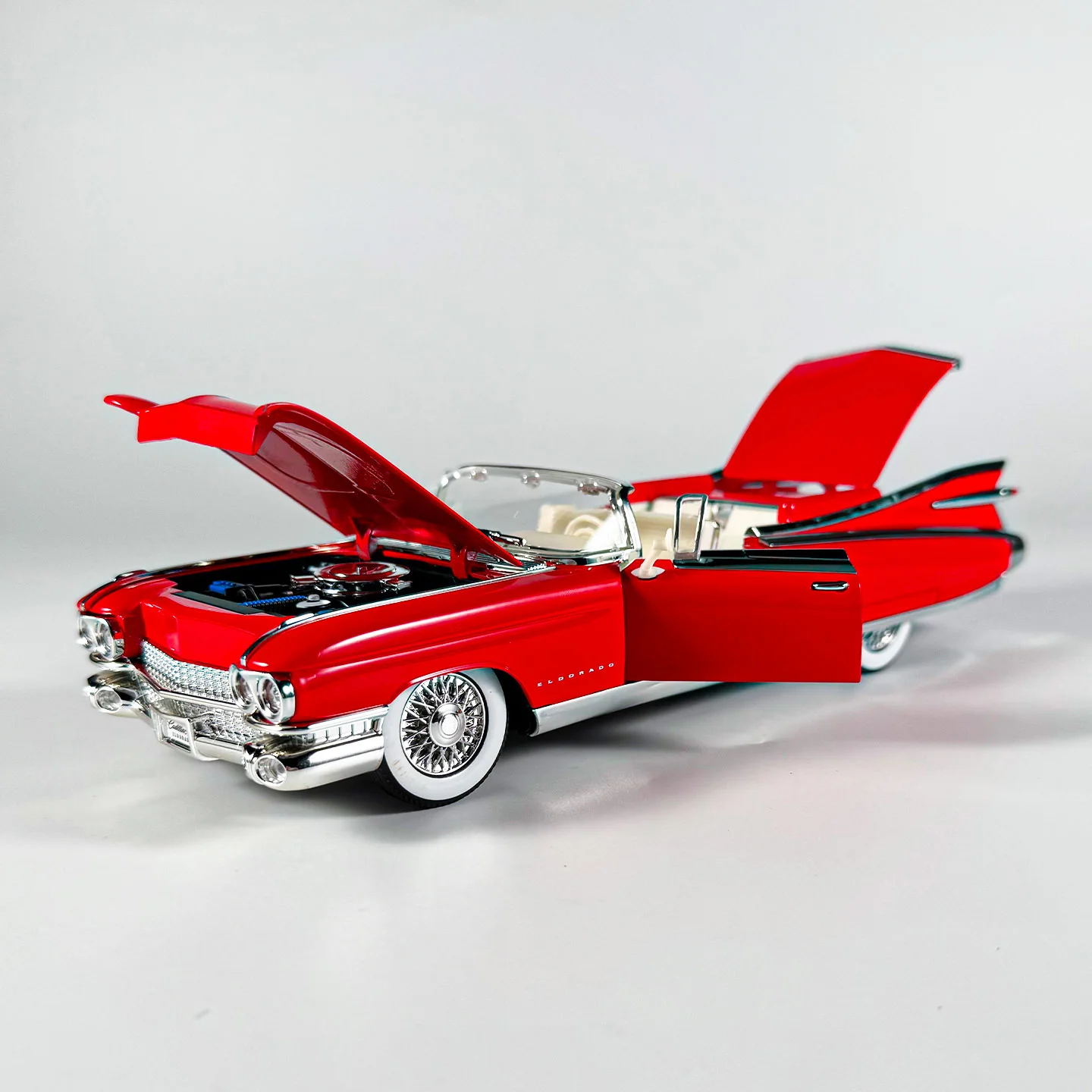 Imagine owning a piece of vintage elegance with this exquisite 1:24 scale diecast metal model of a luxury convertible sports car. Its vibrant metallic red finish radiates sophistication and style, making it a perfect desktop ornament for car enthusiasts and collectors alike. The sleek, flowing lines and classic curves evoke a nostalgic yet timeless appeal, capturing the essence of vintage luxury. Intricate details like the silver front grille, chrome accents, circular headlights encased in bezels, and chrome wheels with white-wall tires enhance its realistic craftsmanship. When displayed, this model becomes a captivating centerpiece, adding a touch of elegance and passion to your collection. Its sturdy alloy construction ensures durability along with visual perfection.