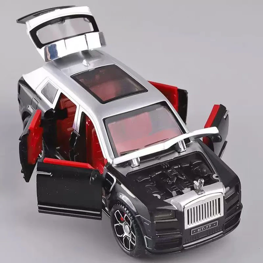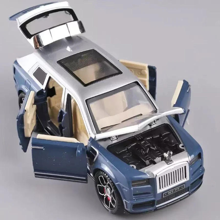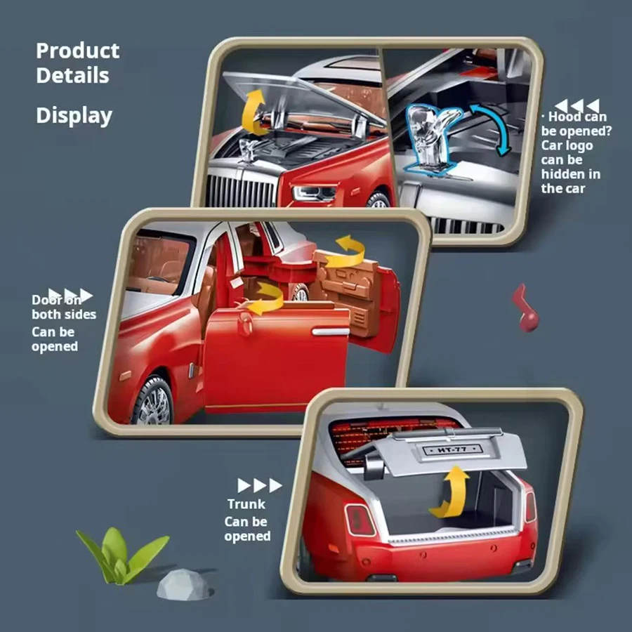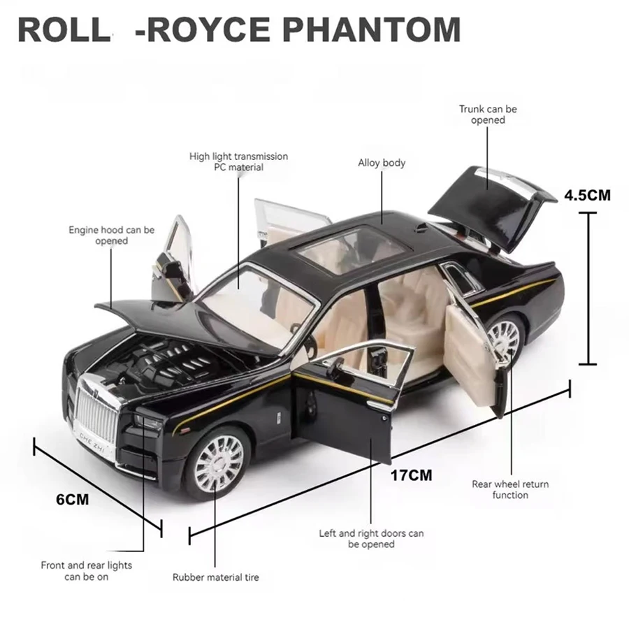 Experience the elegance of a luxury sedan with this 1:24 scale replica of the Rolls-Royce Phantom, crafted from durable PVC plastic. Available in striking red, calming sky blue, pristine white, sophisticated gray, classic black, and playful pink, this model boasts detailed features including a front grille, headlights, side mirrors, styled wheels, and fully functional doors, hood, and trunk. Enhancing its realism, it includes flashing headlights, sound effects, and glowing lighting activated by a touch area on the roof. Perfect for collection or display, this non-electric toy is suitable for ages 4 to 12 and offers a sophisticated, premium aesthetic.