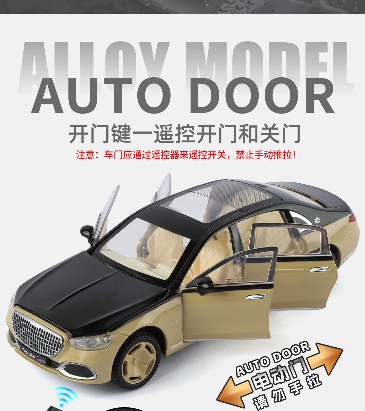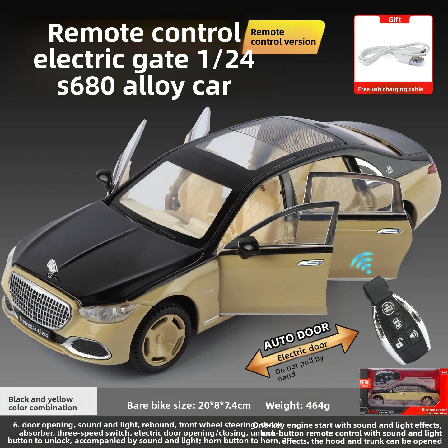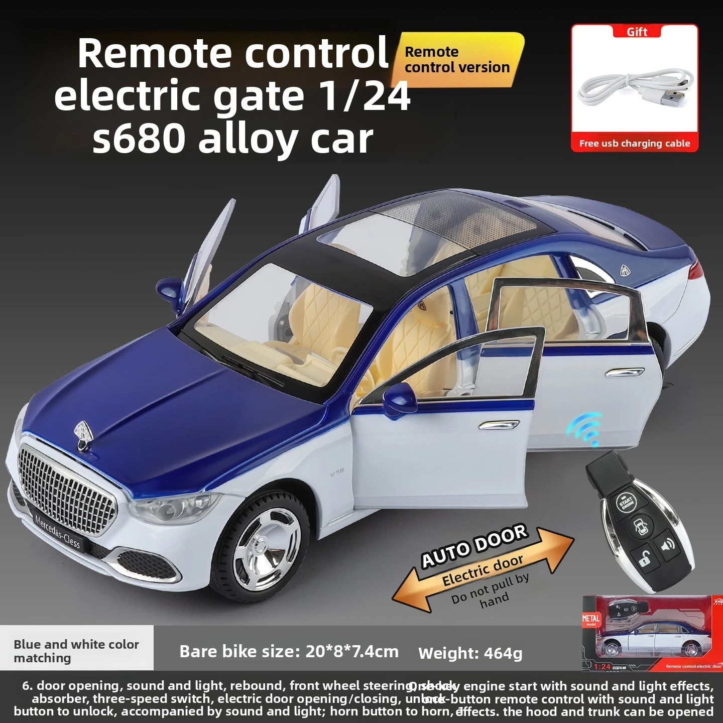 Experience the sleek elegance of this 1:24 scale S680 alloy car model, featuring remote-controlled electric doors with sound and light functions, a pull-back mechanism, and a dual-color body design with highlight electroplated wheel hubs. Measuring approximately 20 x 8 x 7 cm and weighing about 0.85 kg, it offers front wheel steering, four-wheel shock absorption, and a three-gear switch for silent, light, and sound-light modes. Powered by a rechargeable lithium battery with USB charging, the model includes opening hood and trunk, and closed windows, creating a highly realistic, detailed replica perfect for collectors and enthusiasts aged 14 and above.