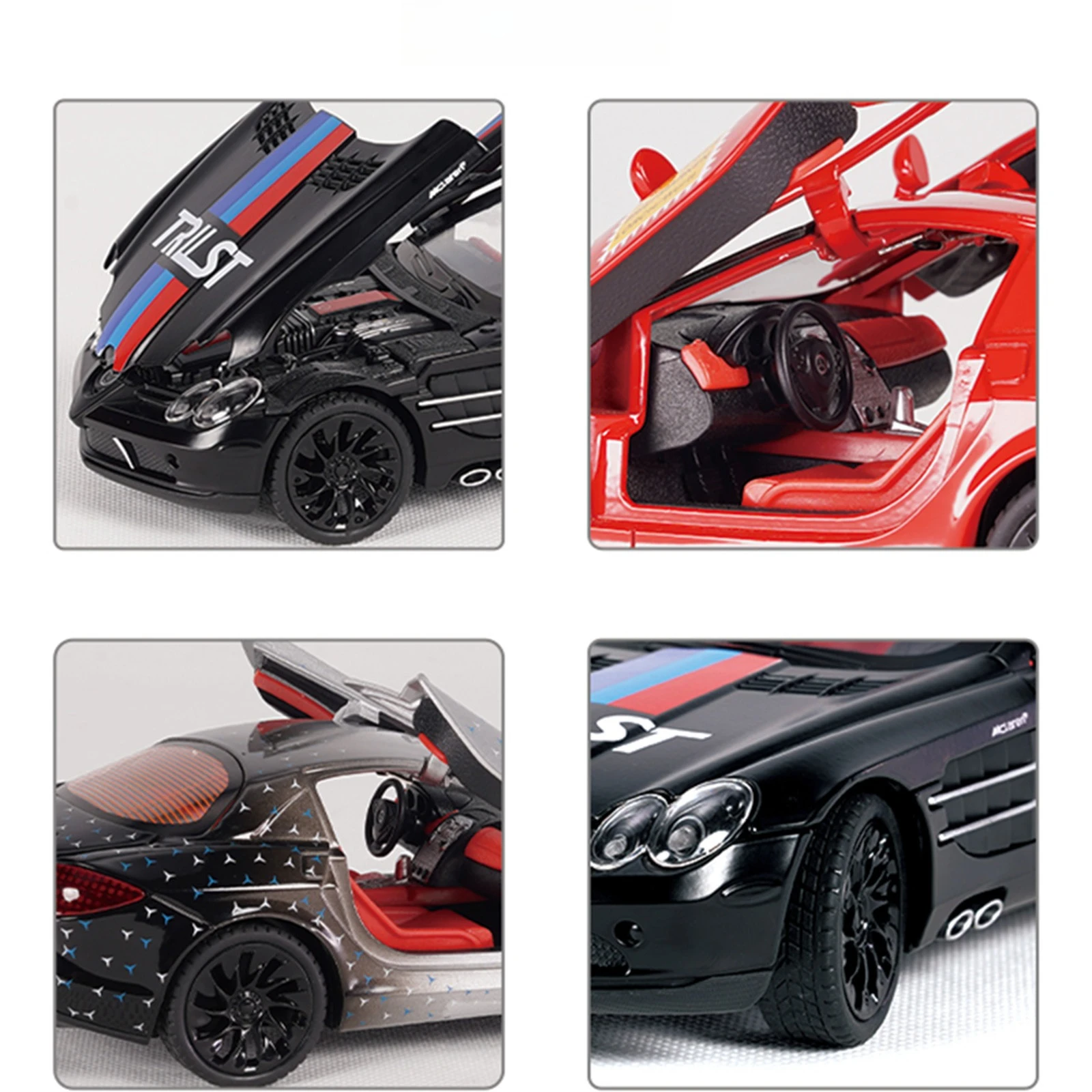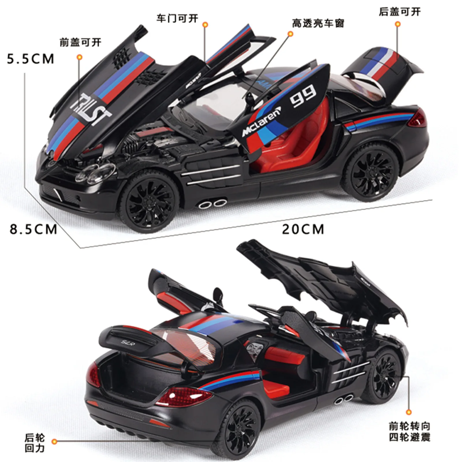 - Realistic front design includes oval headlights, a textured mesh grille, and a sleek hood emblem, mimicking the authentic style of the original SLR McLaren 722 AMG.