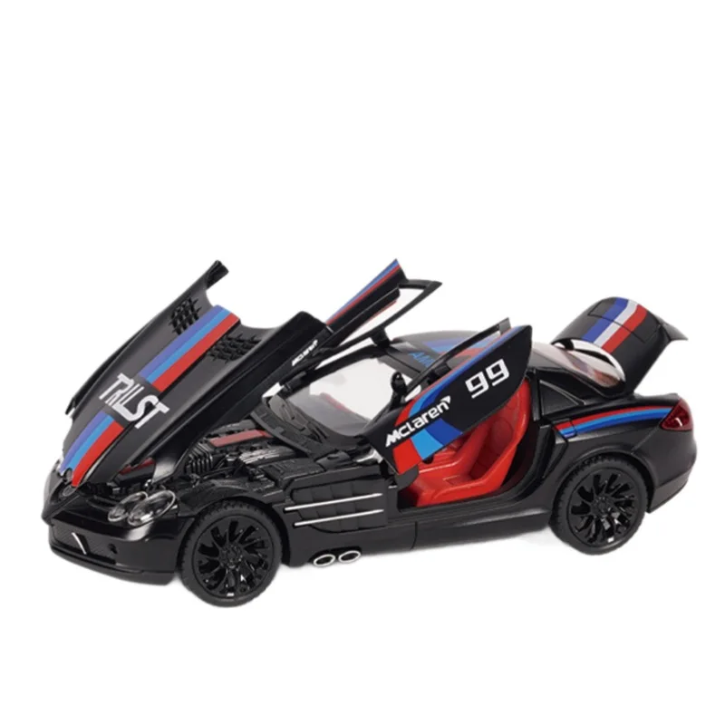 Experience the thrill of owning this highly detailed 1:24 scale diecast model of the iconic SLR McLaren 722 AMG Super Sports Car. Crafted from durable metal, this replica captures every sleek curve and aggressive detail, perfectly reflecting the real car’s sporty aesthetic. The black exterior is enhanced with racing stripes—centered blue flanked by narrower red stripes—that run from front to back, creating a dynamic visual effect. The front features realistic oval headlights, a textured mesh grille, and a small circular emblem on the hood. The side includes racing decals like the white “McLaren” logo, the number “99,” horizontal slits, and small rounded mirrors on slender stalks. The multi-spoked black wheels with detailed tread patterns and wider rear wheels add realism. The transparent windows reveal a vivid interior with striking red seats and dashboard details. This model even sports a subtle rear spoiler and metallic exhaust pipes for authenticity. Ideal for collectors or as a hobby decoration, it’s suitable for ages 14 and up, operated by a button battery, making it a perfect display piece or gift for enthusiasts who appreciate detailed, high-quality diecast models that truly embody speed and precision.