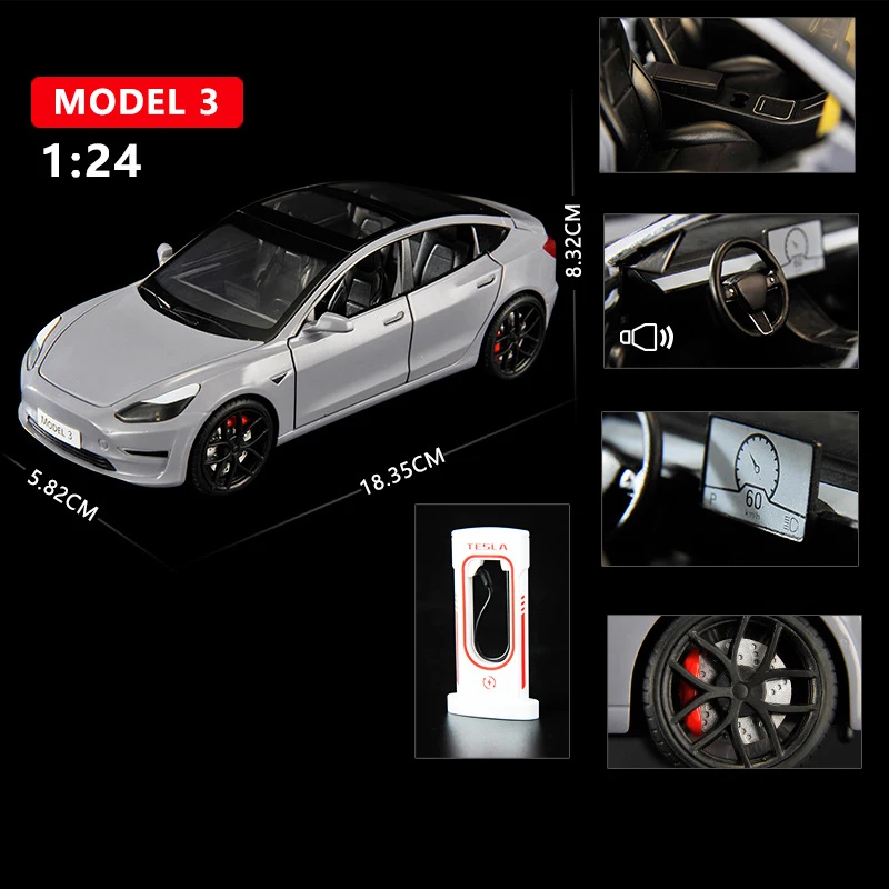 Experience the sleek and modern design of this detailed 1:24 scale Model 3, expertly crafted from alloy and plastic. Its clean white body showcases smooth, flowing lines and a sporty silhouette, perfect for collectors and enthusiasts alike. The sharply contoured headlights and aerodynamic low hood add to its realism, while the uniquely designed black roof panel elevates its stylish appearance. The model features tinted black windows contrasting with the body color, complemented by white side mirrors. Multi-spoke black alloy wheels with red brake calipers and textured tires mimic real vehicle details. This collectible toy also includes a charging station replica and custom logo stickers, making it a perfect addition to any collection or a stunning display piece.