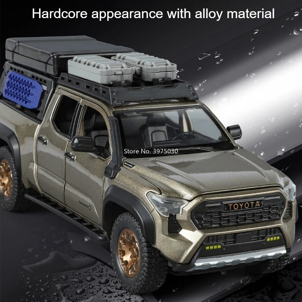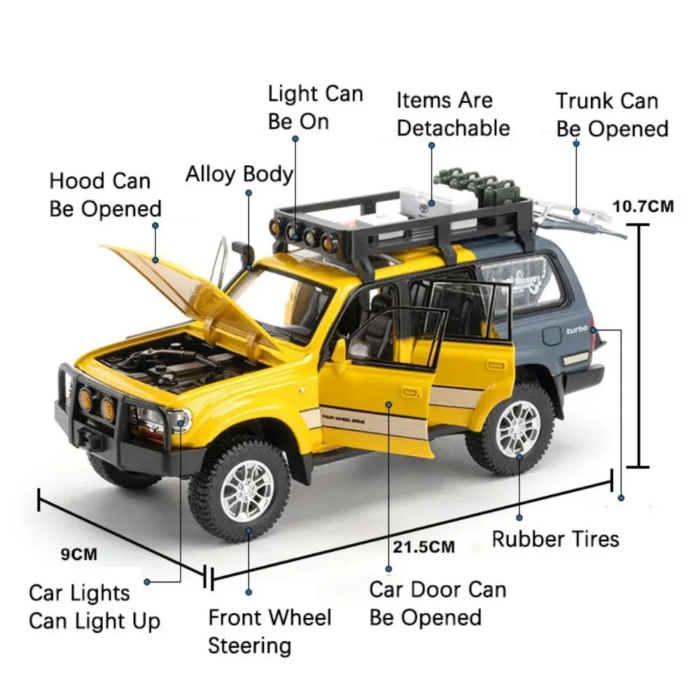 Experience the thrill of owning a highly realistic miniature of the iconic Toyota Tacoma LC80 with this meticulously crafted 1:24 scale diecast model. Featuring a sleek zinc metal body, durable plastic chassis, and rugged rubber tires, it captures every detail of the authentic vehicle. The model's vivid color options—ranging from vibrant orange and white to classic black and gold—allow you to choose your favorite style. The openable six doors, functional sound and light effects, and pull-back mechanism make it an interactive and striking display piece. Compact yet impressive, it’s perfect for collectors, enthusiasts, or as a stunning decorative item that instantly elevates any space. Build your collection today with this high-quality model that offers both aesthetic appeal and play value.