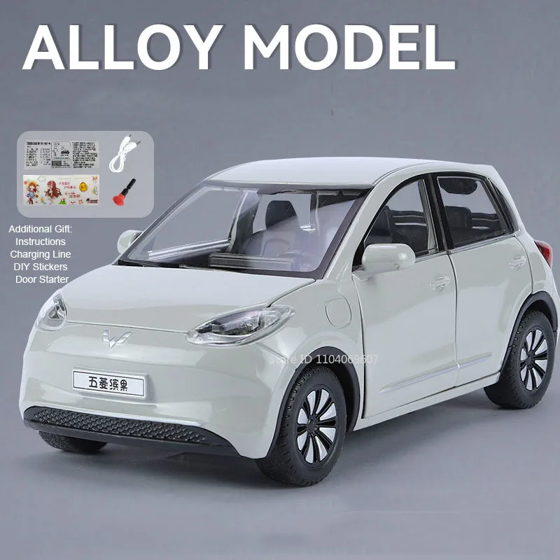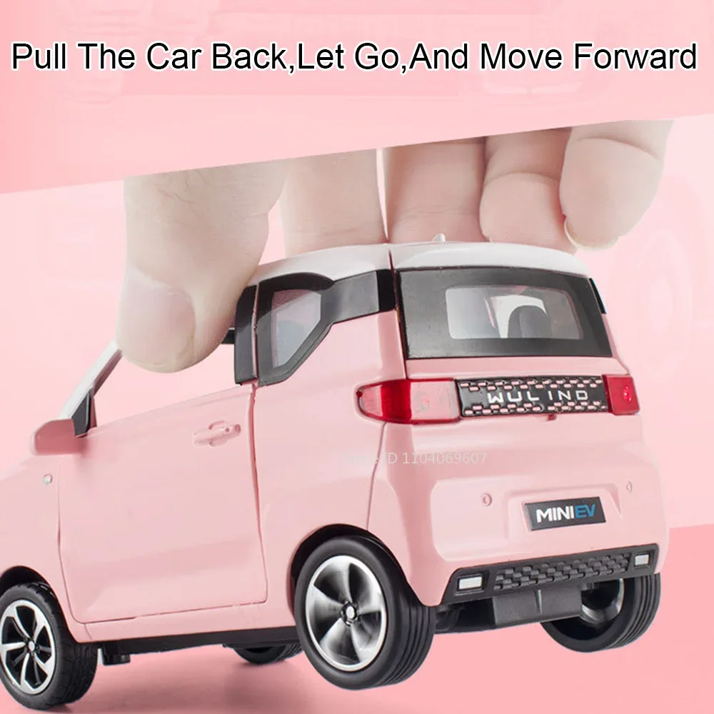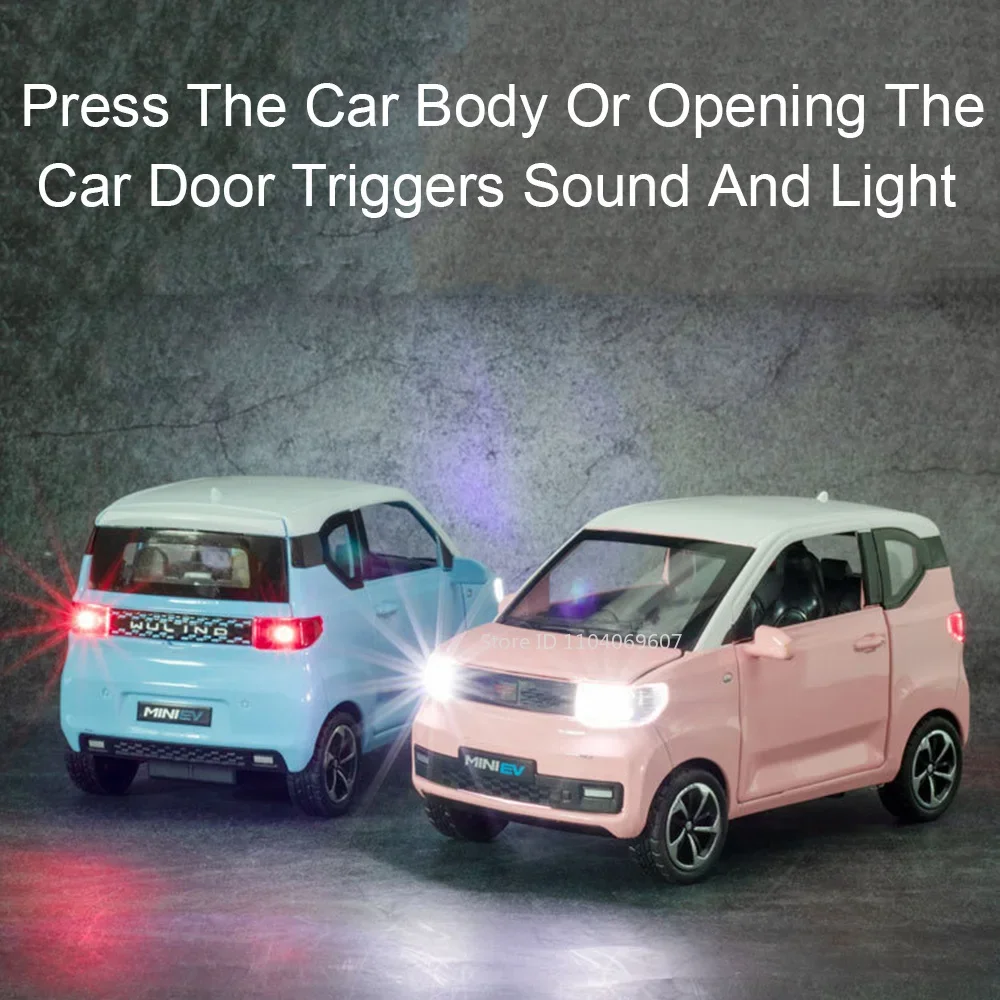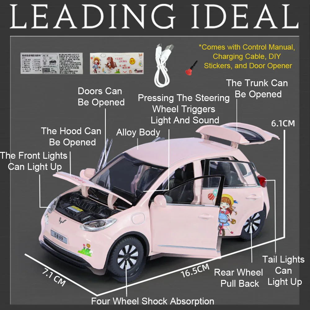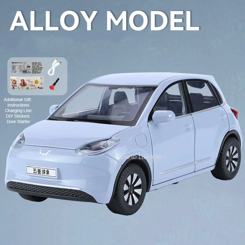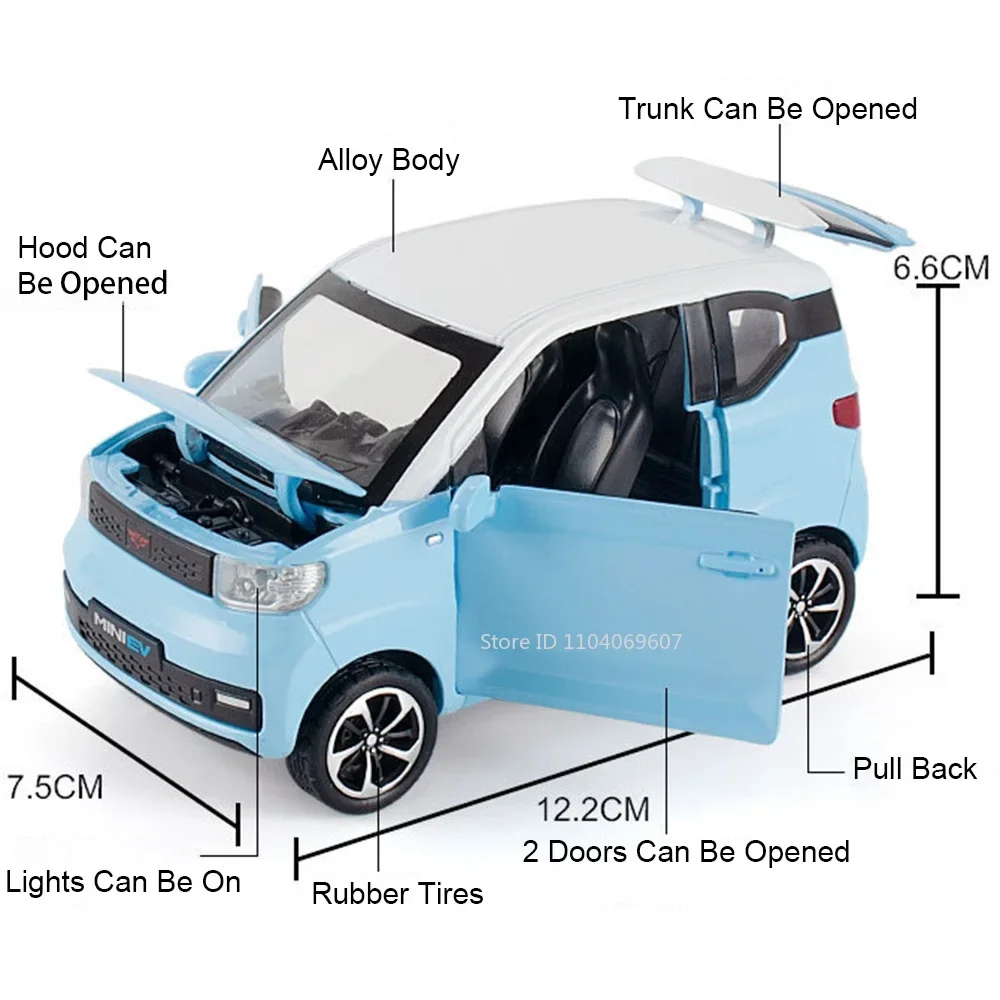 Imagine showcasing this vibrant, highly detailed miniature car on your display shelf or giving it as a thoughtful gift. Crafted to replicate the real Mini EV with precision, this 1:24 scale model combines bright pastel colors like blue, pink, green, and grey for a playful yet realistic appearance. Its compact, boxy design features smooth, rounded edges and detailed elements such as a black grille, clear luminous headlights, and matching side mirrors. The car's sturdy alloy body and rubber tires ensure durability and resistance to impacts. With opening doors, hood, and trunk, as well as realistic sound and light effects, this model brings your collection to life. It’s perfect for collectors and enthusiasts who want a high-quality, functional miniature car.
