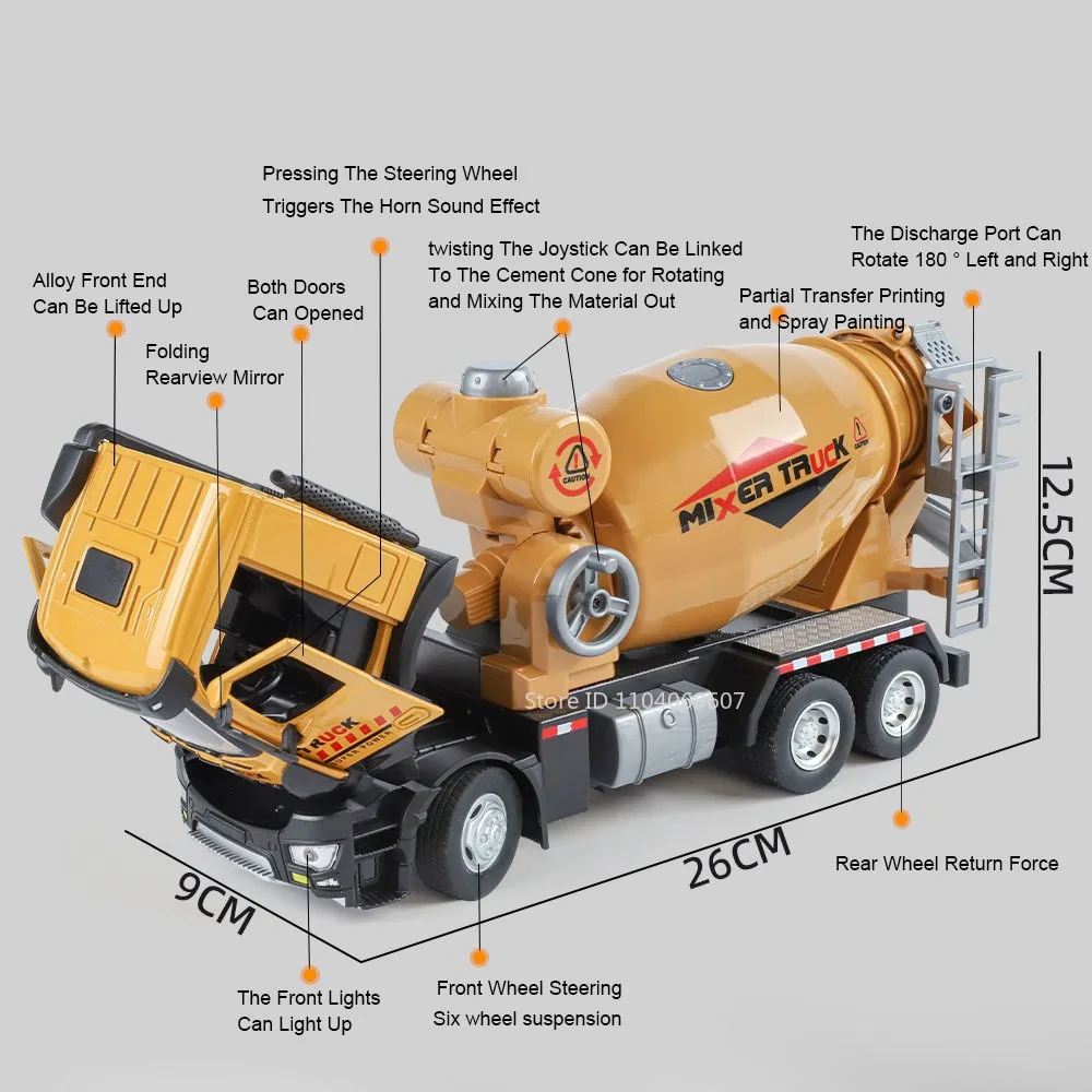 Imagine adding this eye-catching, highly detailed construction vehicle to your collection. Crafted in vibrant yellow with black accents, this model captures the essence of real engineering equipment. Its smooth, polished surface and intricate details like a realistic grille, headlights, side mirrors, and a rotating mixer drum give it a lifelike appearance. The large, extendable crane arm with adjustable joints and hinges allows for dynamic positioning, making playtime both fun and educational. The operable side doors reveal interior details, adding realism and engagement. With sound and light features activated by pressing the steering wheel, this model offers a truly immersive experience. It’s perfect for display, imaginative play, or as a thoughtful gift for enthusiasts or collectors.