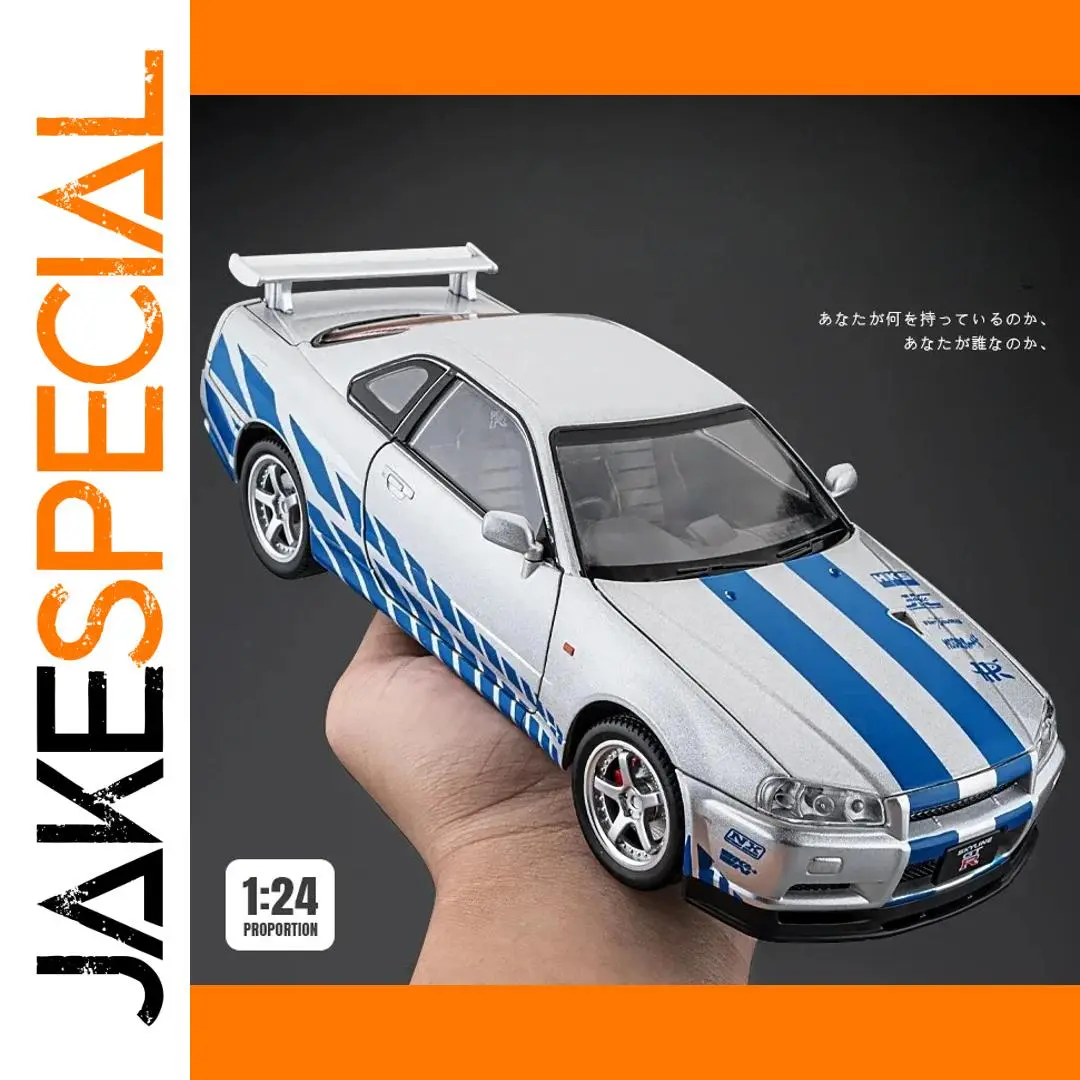 Imagine owning this stunning replica of the iconic Skyline R34 from the Fast & Furious series. Crafted with incredible attention to detail, this diecast alloy miniature captures the sleek, sporty silhouette with aerodynamic finesse. Its metallic silver finish is complemented by bold blue racing stripes, creating a striking contrast that commands attention. The model’s interior, visible through transparent windows, features meticulously molded seats and dashboard, enhancing realism. Equipped with functional sound and light features, this collectible brings the car to life with every display. Available in vibrant colors like purple and white, it’s perfect for showcasing or gifting to automotive enthusiasts who appreciate craftsmanship and detail.