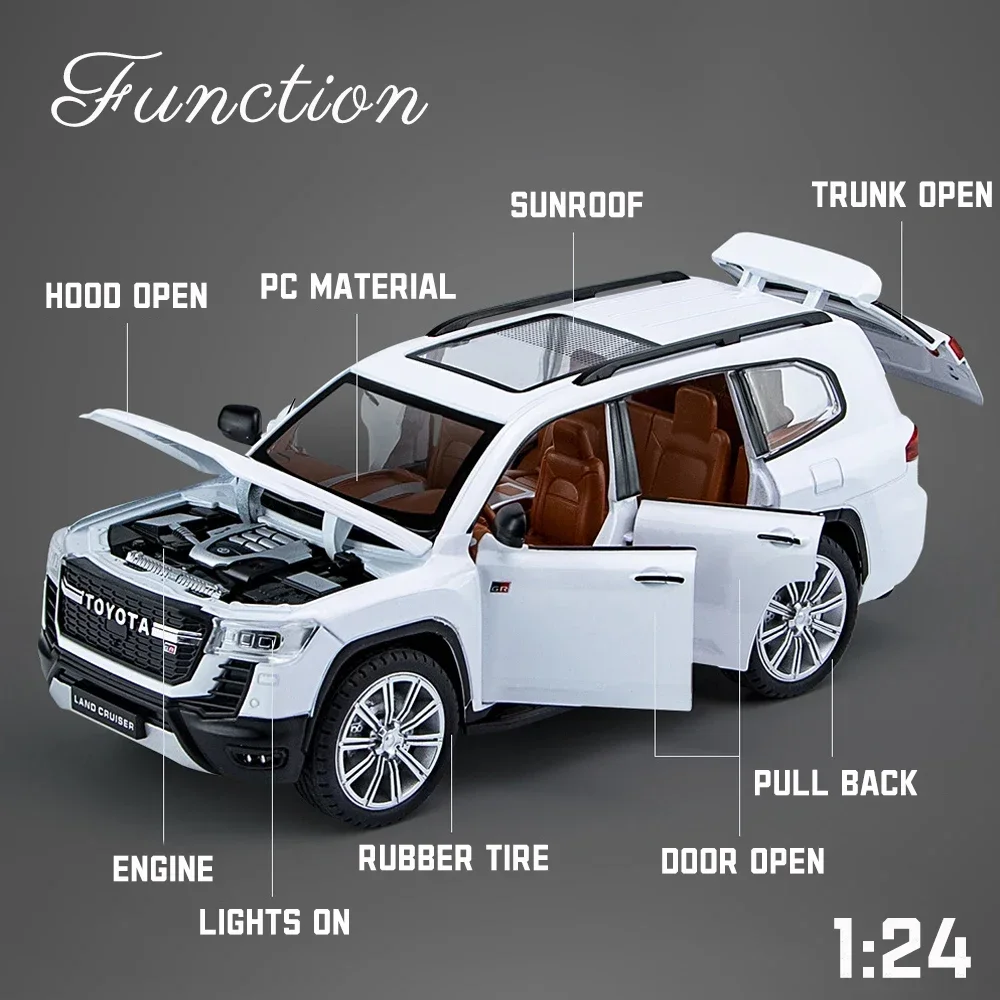 Experience the thrill of owning this meticulously crafted 1:24 scale diecast model of the Toyota Land Cruiser LC300 GR. Its sleek metallic white finish gives it a refined, modern appearance that stands out on any display shelf. The high-simulation design captures the essence of the full-sized SUV, featuring sharp, angular LED-like headlights, a prominent black honeycomb grille with Toyota branding, and detailed side mirrors that add realism. The model also includes roof rack rails, multi-spoke alloy rims with treaded tires, and subtle contour lines for a dynamic look. Enhanced with detailed sound and light functions, it offers an immersive display experience. Made from durable metal, this collectible is perfect for enthusiasts seeking quality and authenticity.
