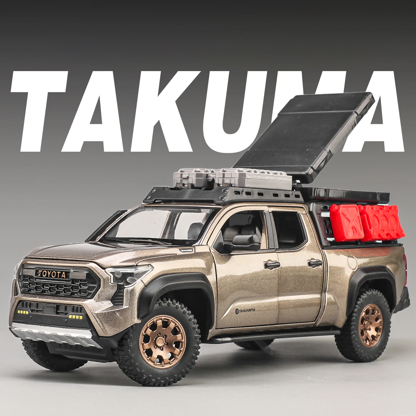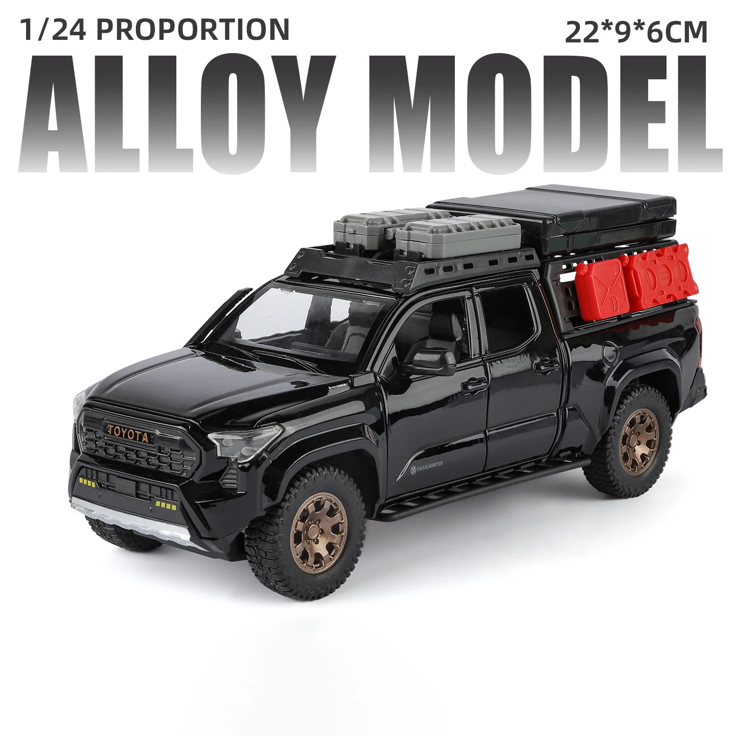 Experience the rugged realism of the 1:24 scale Toyota Tacoma Off-Road SUV diecast model, crafted from durable metal with detailed body lines, black fender flares, textured tires, and transparent windows revealing an interior. Available in white, gold, and black, this model features sound and light functions, a pull-back motor for smooth motion, and a black roof cargo area with a blue storage box for added authenticity. Designed for adult collectors, it offers a lifelike off-road appearance with subtle detailing, making it an ideal addition for enthusiasts who appreciate craftsmanship and functionality in a highly collectible miniature.