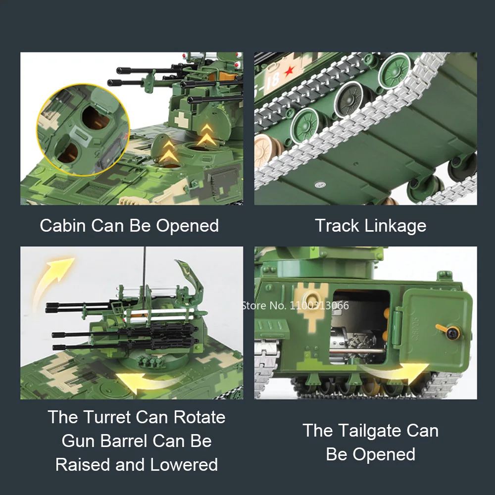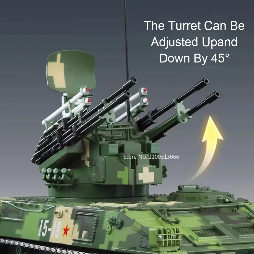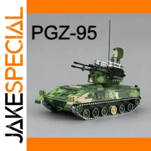Experience the realistic detail of the 1:28 scale PGZ-95 tank toy, featuring a durable metal alloy body with a rugged, military green digital camouflage pattern highlighted by tan patches. Its sturdy rectangular shape, angular armor panels, and textured surface details replicate the authentic military design. The model includes an adjustable black gun barrel, rotating rubber tires, a functional open tailgate, and small weapon attachments such as white missile-like structures and a tall black antenna. Measuring approximately 24 cm long, 12 cm wide, and 16 cm high, this highly detailed diecast vehicle offers durability and precision, making it perfect for collectors and enthusiasts aged 14 and above.
