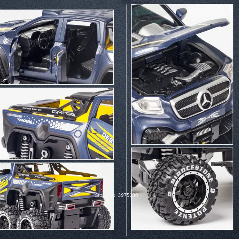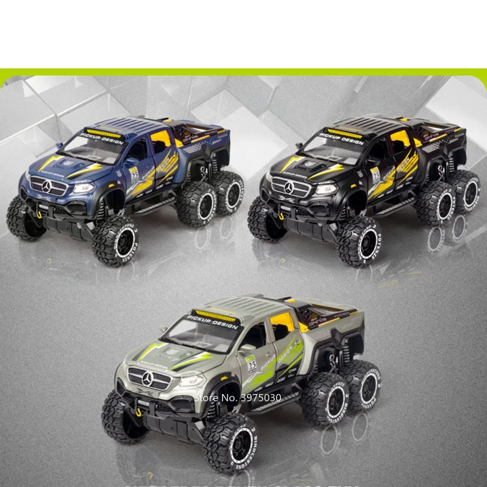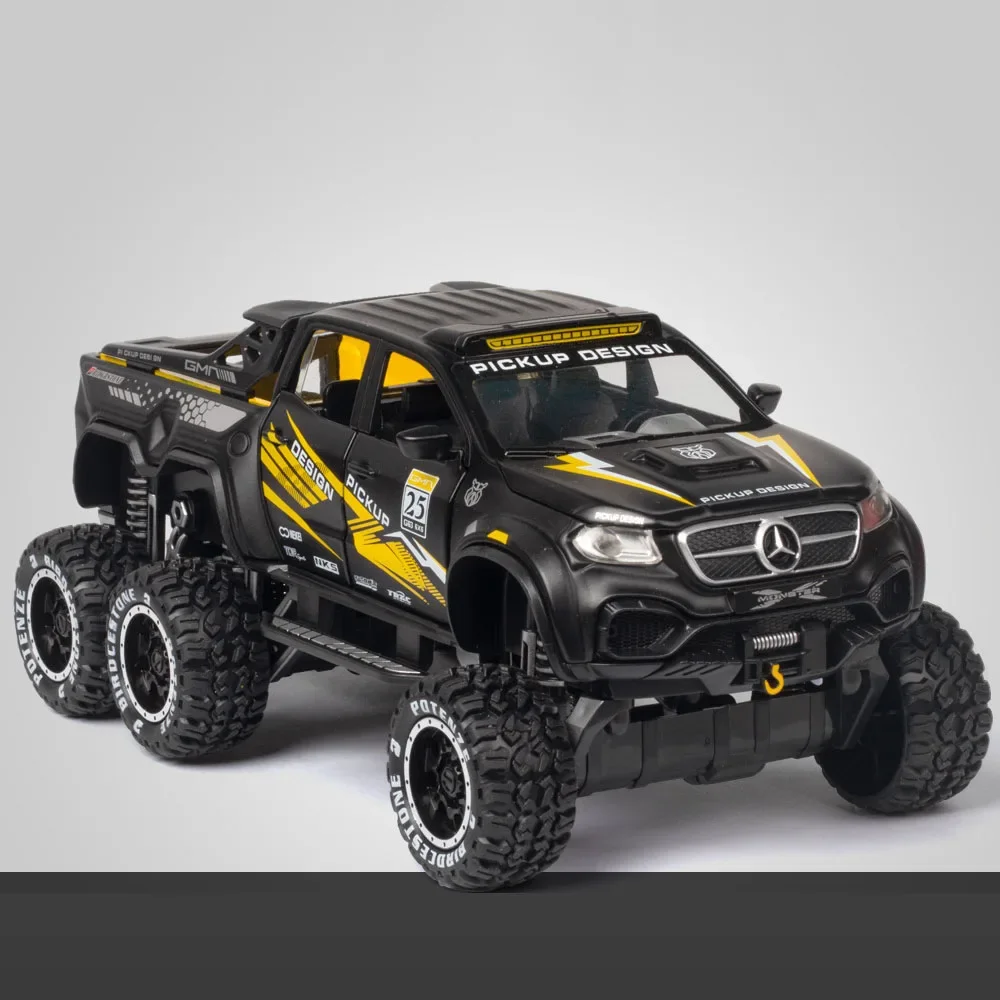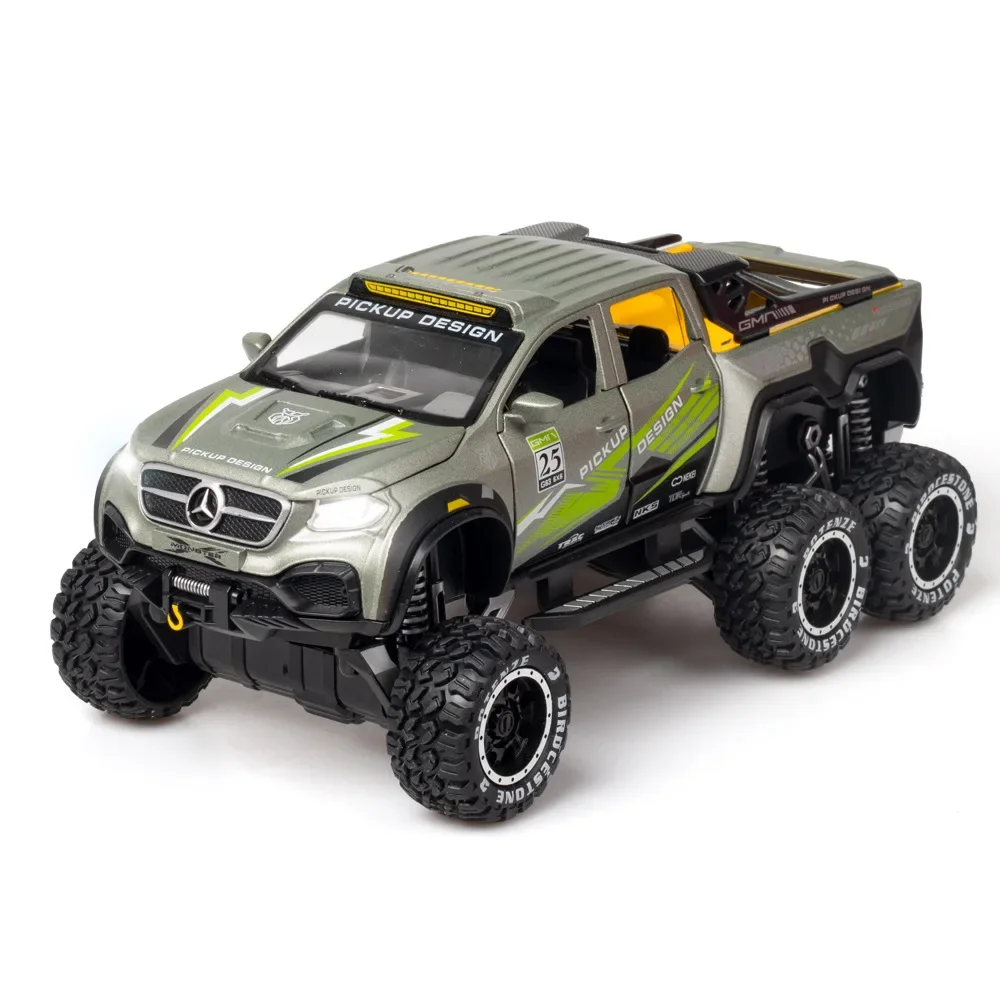 Experience the thrill of off-road adventures with this meticulously detailed 1:28 scale diecast alloy truck. Its rugged design features a metallic, dark-colored body in shades of blue, silver, or black, giving it a durable, high-performance look. The bold front grille with a Mercedes-Benz emblem, combined with vibrant yellow and white decals, adds a dynamic visual appeal. Equipped with massive, deep-tread rubber tires mounted on black spoked wheels, the model convincingly captures off-road robustness. Functional details like openable doors, operational sound and light features, and a pull-back mechanism make this vehicle both realistic and fun. Crafted with a zinc alloy body and plastic chassis, it’s a durable collectible that boasts a commanding presence on display or during play.
