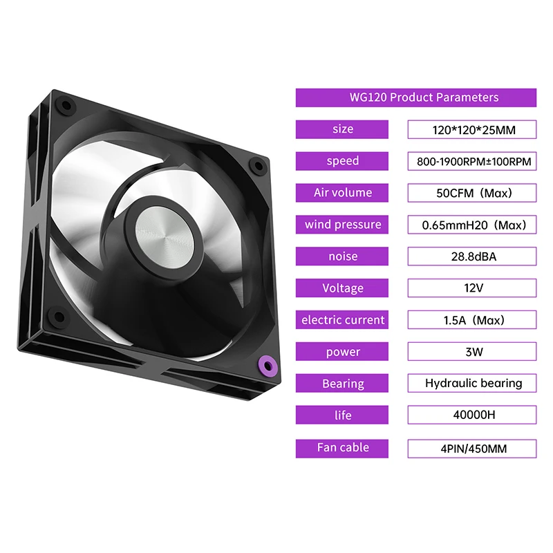 - Technical specifications include a 120mm diameter, 1900 RPM rotational speed, 4-pin PWM connector, operating voltage of 5V, power use of 3W, and durable PBT casing with shock pads for long-lasting performance.