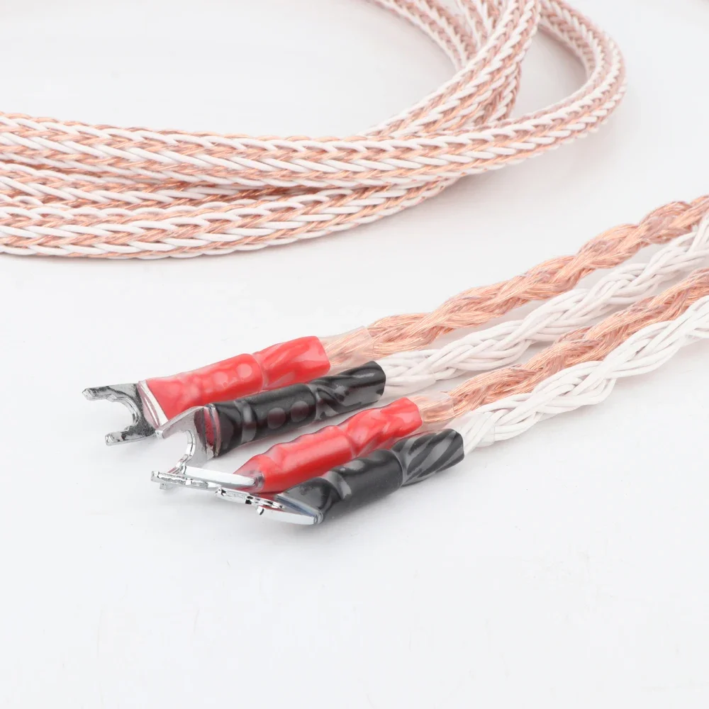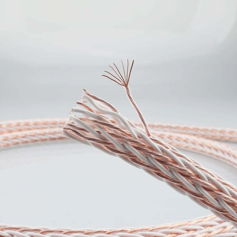 Experience premium sound quality with this elegant 12TC Hi-Fi speaker cable. Crafted with meticulous attention to detail, it features 24 ultra-high purity 99.9999% OCC braided copper conductors, ensuring superior conductivity and durability. The cables are coated with a semi-transparent, light pink or peach-colored outer sheath that reveals the intricate internal strands, creating a delicate, aesthetic texture that elevates your home audio setup. Terminated with high-quality red copper plated banana plugs, these cables provide a secure and reliable connection. The overall diameter of 12.90mm and insulation with PTFE (Teflon) ensures flexibility and insulation. Whether upgrading your system or setting up new speakers, this cable offers both aesthetic appeal and outstanding technical performance for demanding audiophiles.