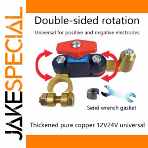 Enhance your vehicle’s safety and reliability with this durable 12V/24V car battery cut-off switch featuring an automatic circuit breaker with anti-power off leakage protection. Crafted with copper-plated, Type B components, it offers universal positive and negative poles for easy, hassle-free installation. The sturdy rectangular body in matte black is complemented by a bold red oval switch handle mounted on a blue labeling area with clear directional arrows, ensuring both functionality and visibility. Designed for automotive applications, it supports double-sided rotation for secure fixing with adjustable screws, making installation straightforward. Built with high-quality, chemical-free materials, this switch provides long-lasting performance and peace of mind for your vehicle’s electrical system.