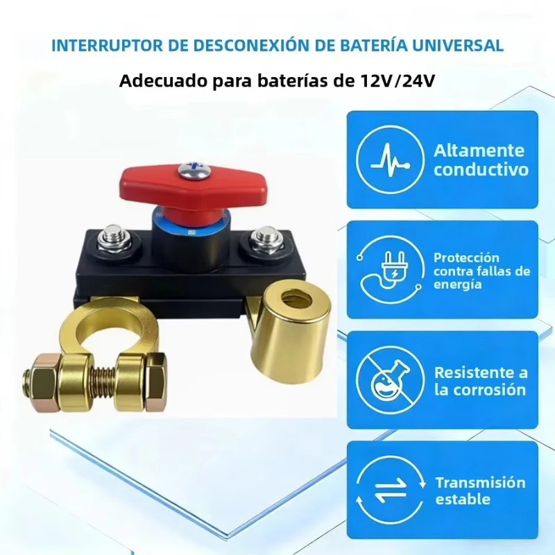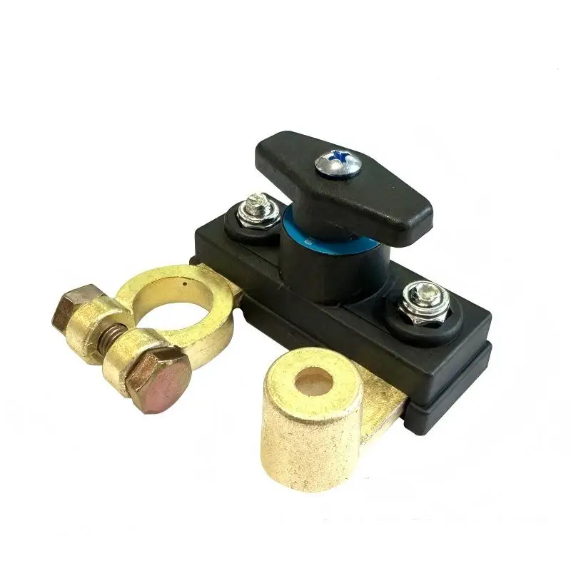 Imagine easily securing your vehicle's battery connection with this sleek, high-performance cutoff switch. Designed to operate efficiently at 12V or 24V, it fits seamlessly into cars, trucks, RVs, and ships. The black rectangular base, made of durable plastic or composite material, provides a clean, modern foundation. Its shiny, metallic terminals on top add a touch of industrial sophistication, ensuring reliable electrical connectivity. The large, T-shaped red knob is ergonomically designed for easy grip, allowing quick manual control to disconnect or restore power without tools. Brass or gold-colored connectors offer exceptional conductivity and corrosion resistance, complementing the overall aesthetic. This compact, sturdy assembly combines safety and style, giving you confidence in your vehicle's electrical management.