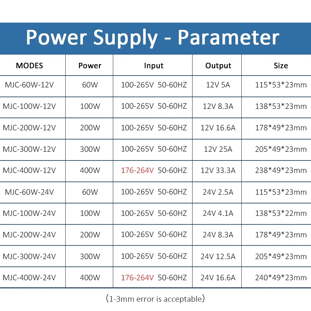 - Supports input voltages of AC 110-250V (60W–200W) and AC 170-250V (300W–400W), ensuring compatibility across various regions and setups.