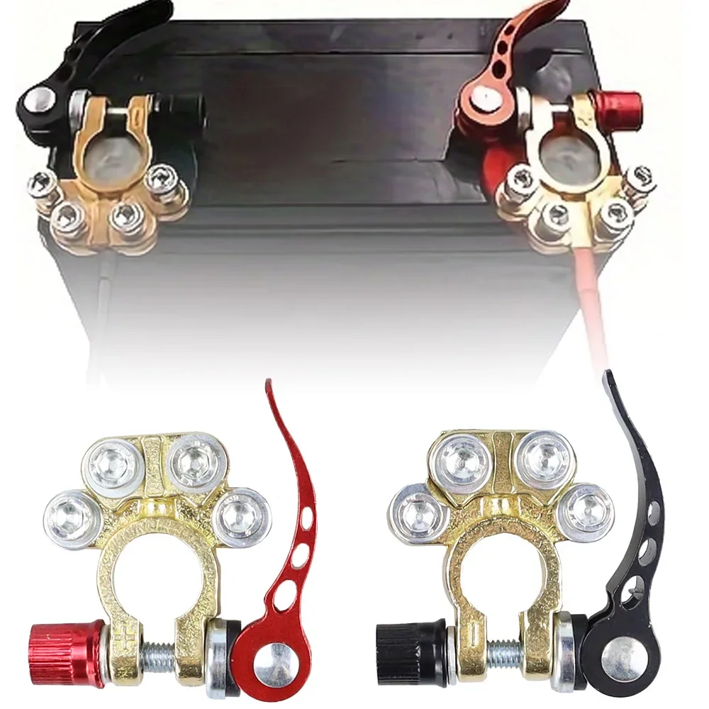 These professional 12V SAE/JIS Type A battery terminal clamps come as a set of two, engineered specifically for automotive applications. The distinct metallic gold finish paired with colorful levers—one red and one black—not only enhances aesthetics but also provides ease of use during installation. Built from a sturdy metal alloy, these clamps resist corrosion and ensure high conductivity, promoting a long service life. With specific cathode sizes ranging from 17.5 to 19.1mm and anode sizes from 15.9 to 17.5mm, these clamps guarantee a secure and stable electrical connection, making them ideal for maintaining your vehicle's battery performance.