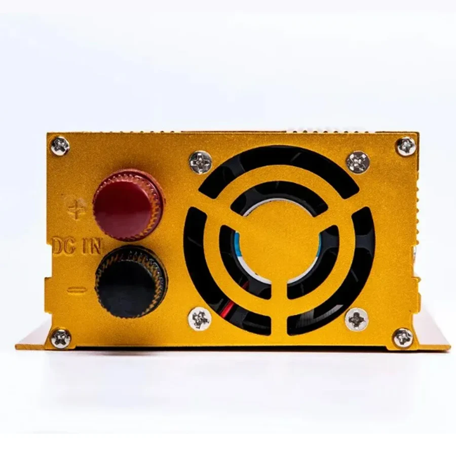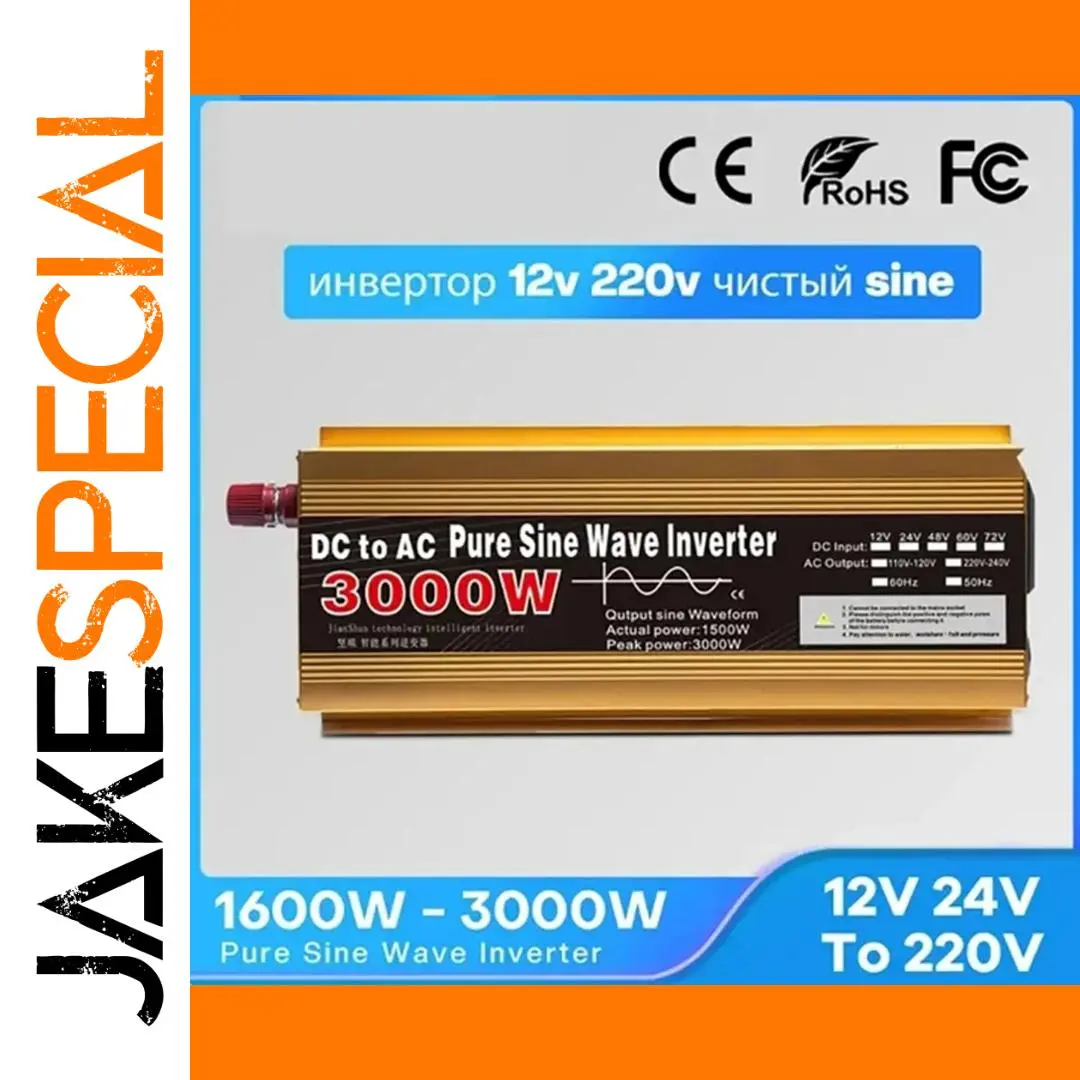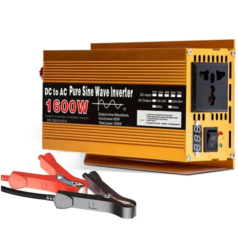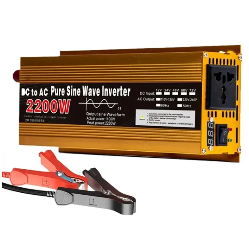 This pure sine wave inverter combines functionality and style in a robust metallic gold casing, reflecting a professional and sleek aesthetic. Engineered for high performance, it supports power outputs of 1600W, 2200W, and peak power up to 3000W, making it a versatile choice for various applications. Its black label clearly displays essential specifications, including input voltage options of 220V and output voltages of 12V and 24V. The accompanying graphical representation of the sine waveform illustrates the clean power. Ideal for both home and automotive use, this inverter is tailored to meet diverse electrical needs seamlessly.