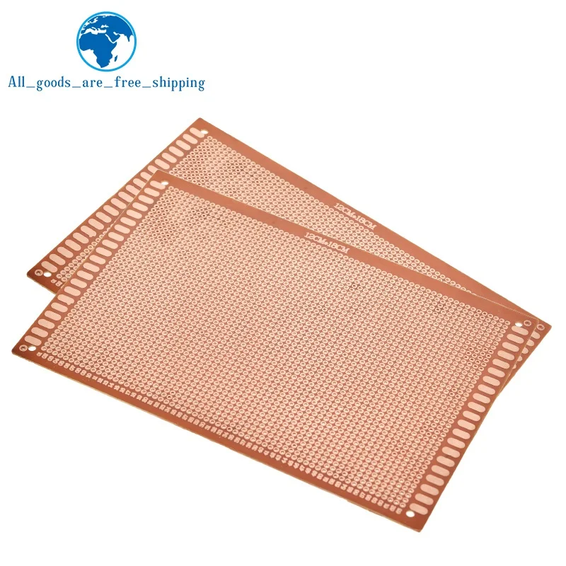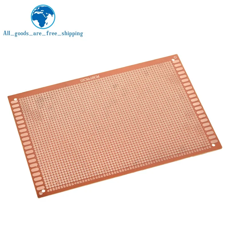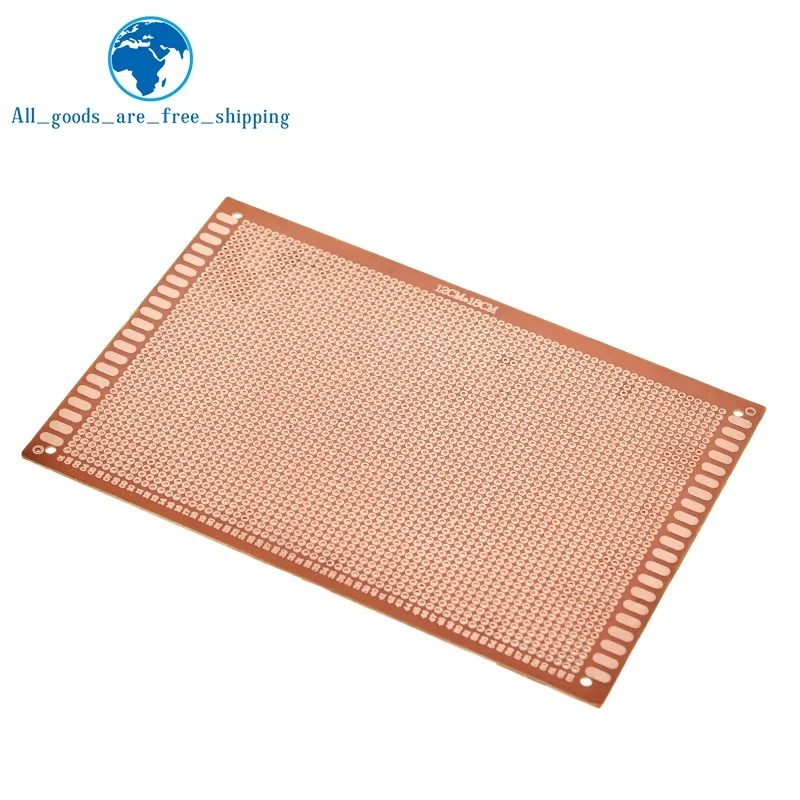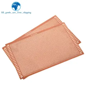 Experience precise electronic prototyping with this TZT 12×18 cm single-side breadboard, featuring a copper-plated surface for reliable circuit connections. Made from durable bakelite with a sleek copper finish, it offers a 2.54 mm (0.1 inch) grid spacing, ideal for switches, sensors, and STM microcontroller projects. The minimalist rectangular design highlights a systematic array of tiny circular pinholes arranged in a uniform pattern, complemented by elongated slots along the edges for versatile mounting. This customizable, chemical-free circuit board is perfect for hobbyists and professionals alike, providing a reliable platform for experimentation and development in a modern, functional aesthetic. Available in sets of 1 or 3 pieces.