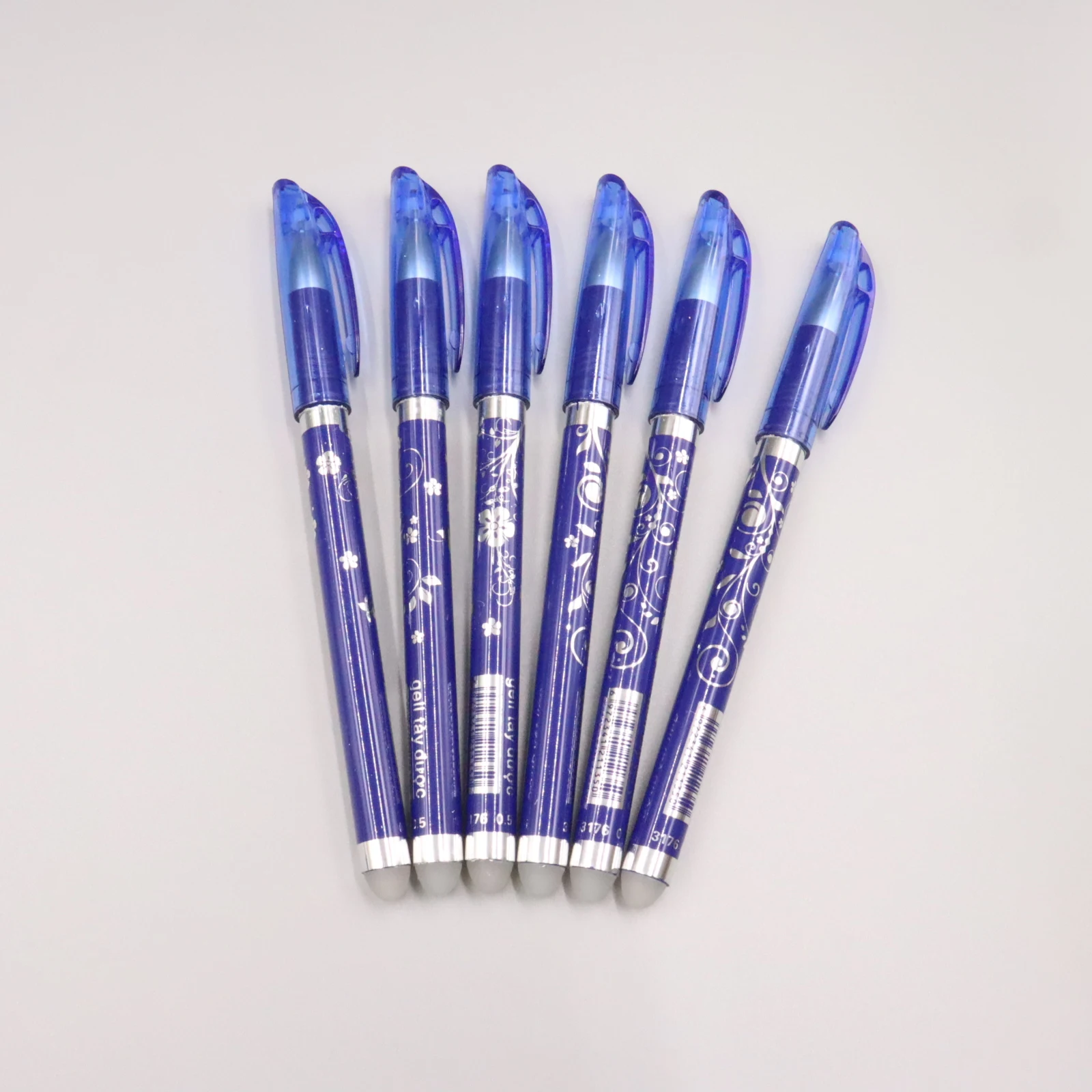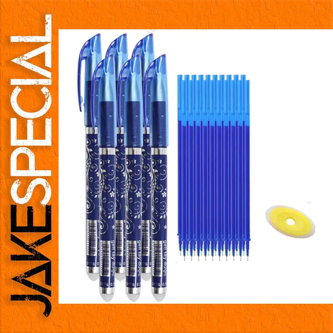Elevate your writing experience with this exquisite 13-piece erasable gel pen set. This collection includes two beautifully designed gel pens featuring a decorative blue barrel adorned with silver floral patterns that provide a touch of elegance. Each pen features a comfortable, translucent grip and a fine 0.5mm nib, ensuring precise writing. Accompanying them are 10 vibrant blue and 10 black refill cartridges, perfect for all your needs at school or the office. The washable nature of the ink makes corrections easy, allowing you to write freely. Each component is crafted from durable plastic, making the pens both stylish and functional.