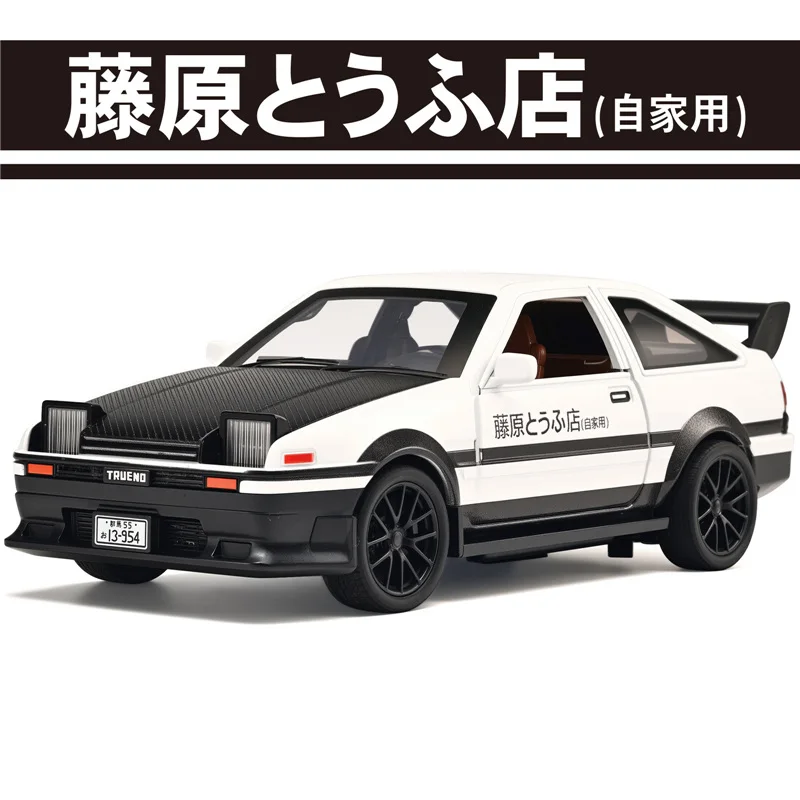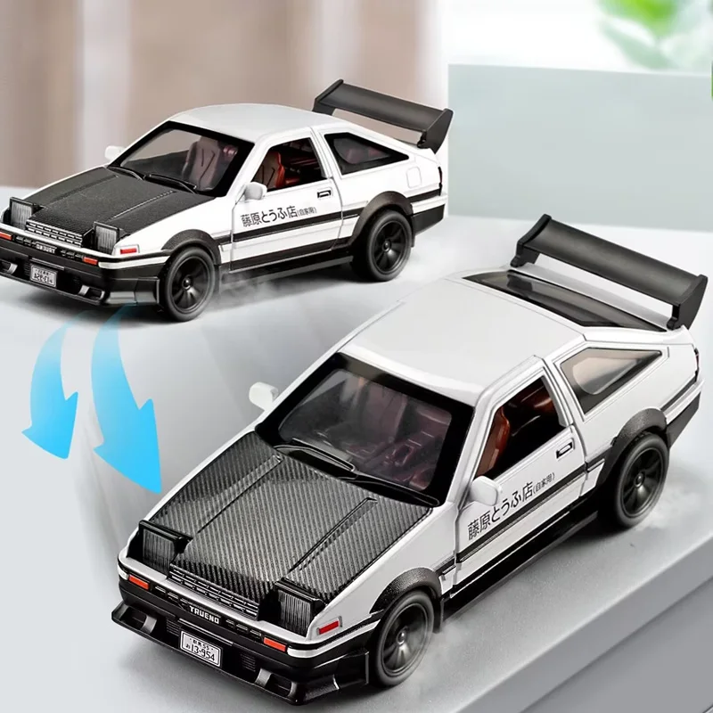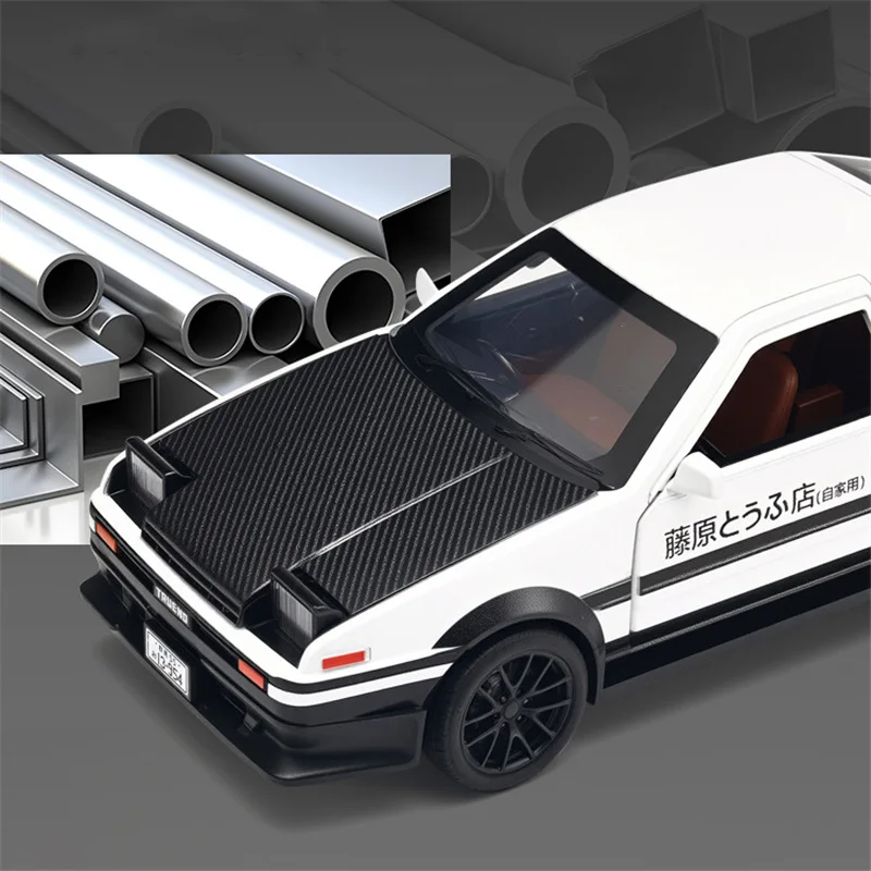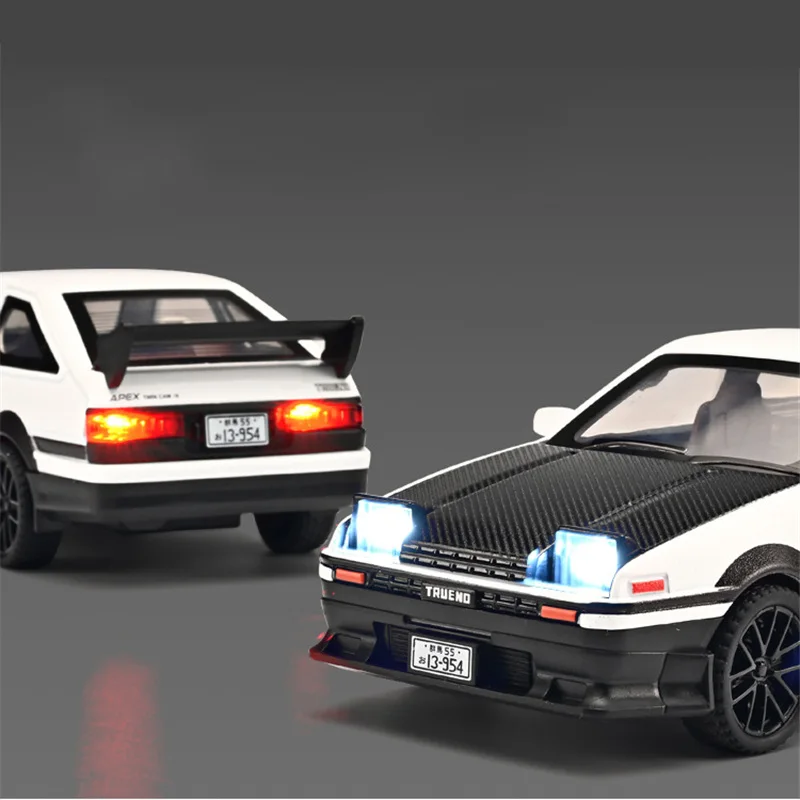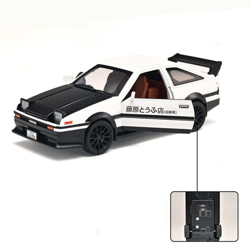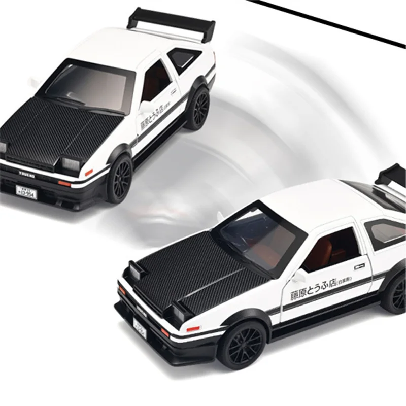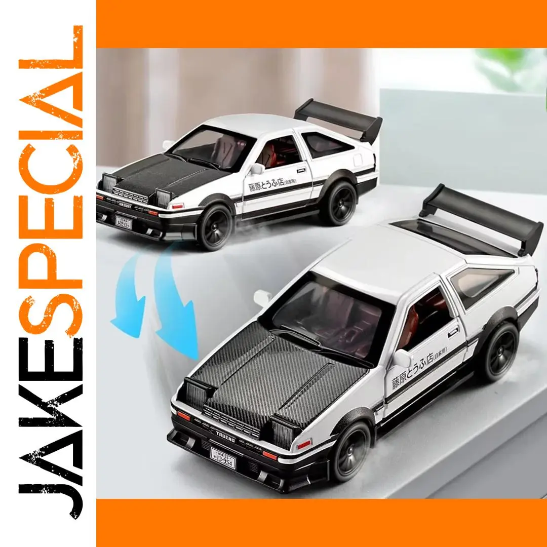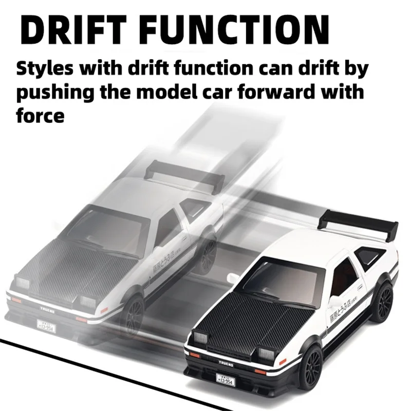 Experience the thrill of racing with this highly detailed 1:32 scale alloy sports car model inspired by the iconic initial D AE86. Crafted from durable diecast metal and plastic, this replica captures every essential detail, from the sleek aerodynamic body to the textured carbon fiber hood. The black finish is accented with subtle decals and a bold racing stance, enhanced by a large rear spoiler and realistic alloy wheels with textured rubber tires. Designed for enthusiasts and collectors, it features sound and light functions that bring the drifting experience to life. Perfect as a gift or display piece, this model allows you to relive the excitement of the legendary AE86 in stunning miniature form.