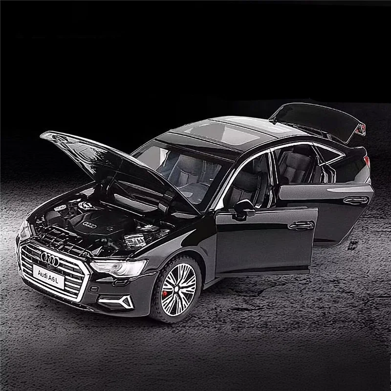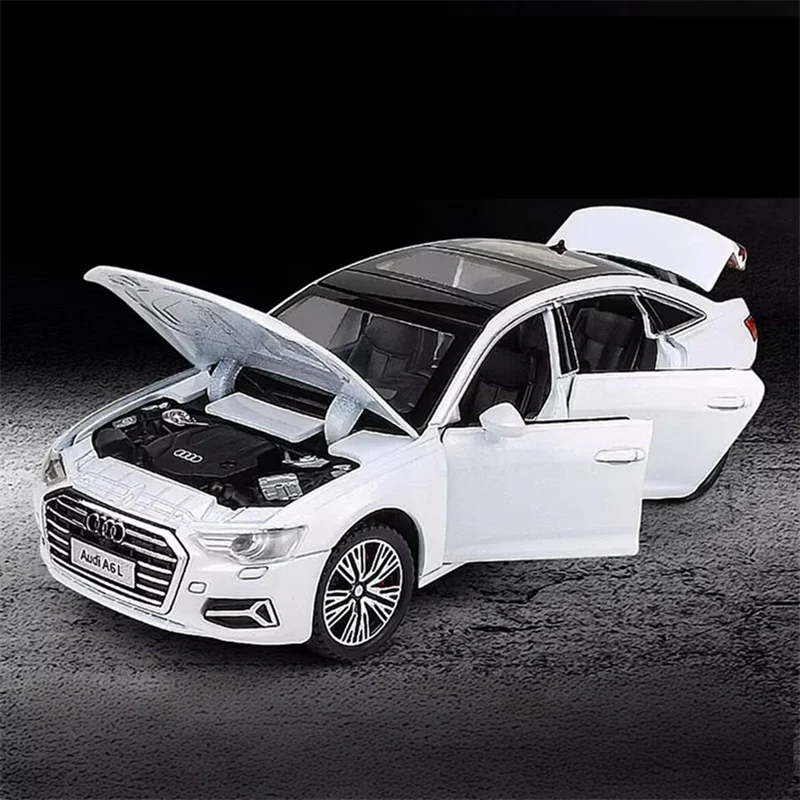 Experience the sleek elegance of this 1:32 scale alloy model of the A6/A6L, crafted from durable alloy and plastic with a glossy black finish. It features chrome accents on the grille, door handles, and tail lights, detailed multi-spoke silver rims, aerodynamically accurate lines, and transparent windows with a subtle tint revealing a finely detailed interior. Equipped with simulated sound and light effects activated by a switch, this high-quality collectible showcases realistic craftsmanship and modern design, making it an ideal display piece for enthusiasts and collectors alike. Available in black, gray, and white to suit any collection.