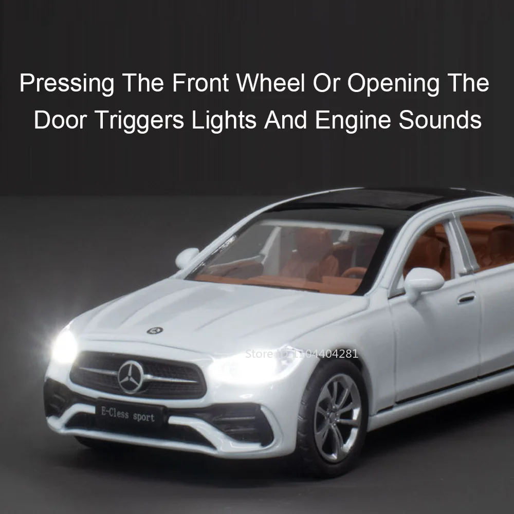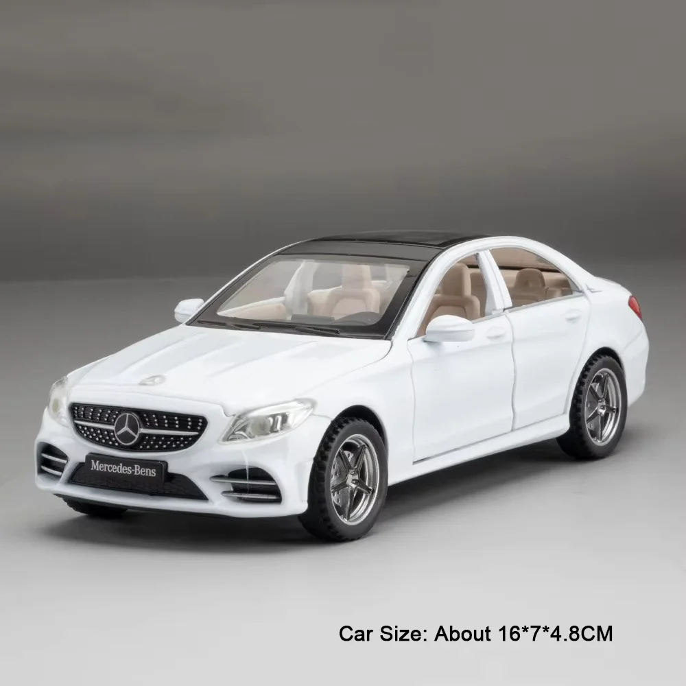 Experience the thrill of owning a highly detailed replica of luxury vehicles with this stunning 1:32 scale alloy car model. Crafted with a sturdy metal body, plastic chassis, and rubber tires, these models combine durability with realism. The sleek design captures the elegant curves and contours of real cars like the E300L and C260L, featuring opening doors, detailed alloy rims, and textured rubber tires. The models boast realistic lighting and sound effects, easily activated with pull-back movement—bringing your display to life. Perfect for collectors, enthusiasts, or as a standout gift, each model construction emphasizes craftsmanship and attention to detail. Size options make these models ideal for display on shelves or desks, elevating any collection with their modern aesthetic and sophisticated finish.