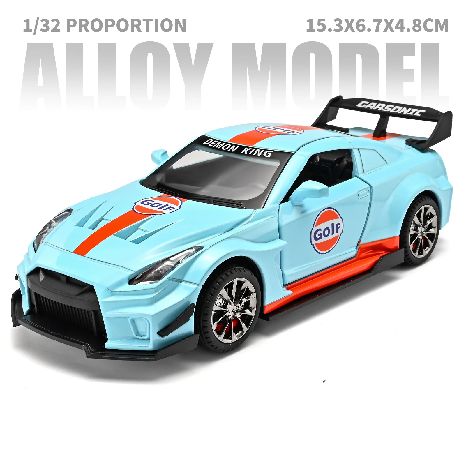 Experience the thrill of owning a meticulously crafted replica of the iconic Nissan GTR R35. This 1:32 scale alloy model displays a sleek, aerodynamic silhouette with a low-profile stance, perfect for display or collection. Its exterior, available in striking colors such as silver, blue, white, or black, features a polished, shiny finish that reflects light beautifully. The detailed decals and racing graphics evoke a sense of speed and competition. Carefully designed with realistic elements like grille, headlights, side mirrors, and a prominent rear wing spoiler, this model captures the essence of a high-performance sports car. Feel confident knowing this durable diecast toy combines craftsmanship, safety, and aesthetic appeal, making it an ideal addition to any collection.