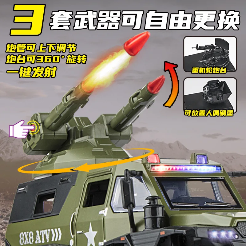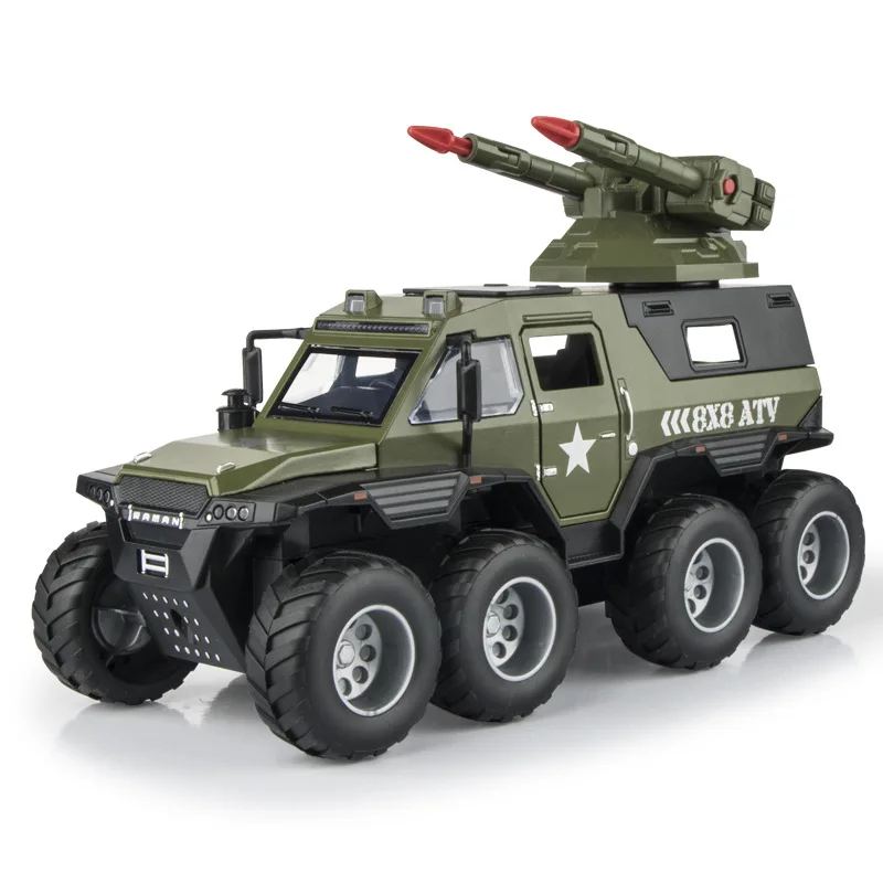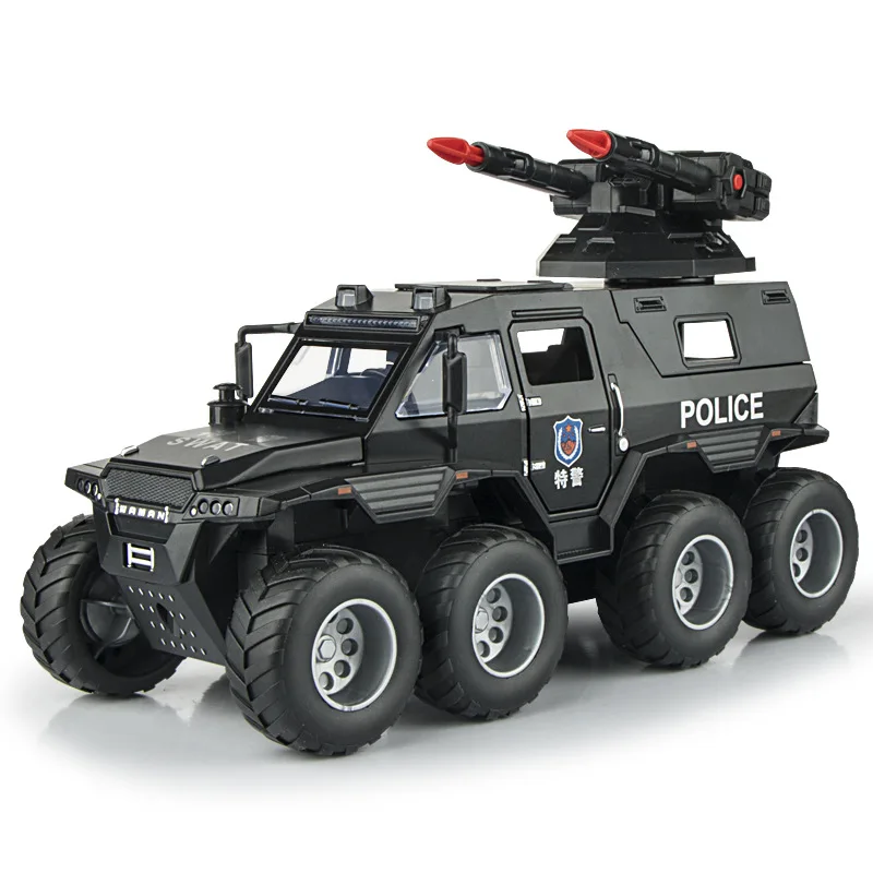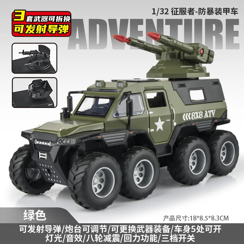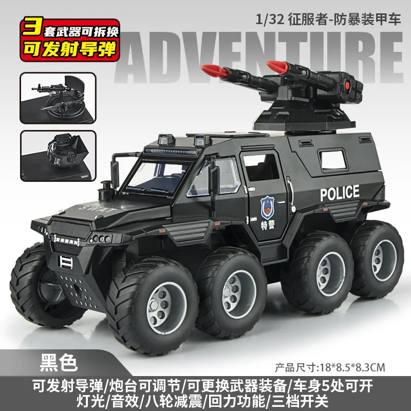 Experience the thrill of adventure with this detailed 1:32 scale alloy off-road police vehicle, available in eye-catching green, black, and boxed variants. Crafted with a rugged military-inspired design, it features large black off-road tires with prominent tread patterns, a textured black grille, and durable angular bodywork. Multi-colored LED emergency lights in red, blue, and purple add vibrancy, while realistic sound effects, including siren and fire drill, enhance play realism. Powered by button batteries, this collectible toy is perfect for enthusiasts aged 14 and above, serving as an ideal gift or display piece for those who appreciate detailed military-style vehicles with bold, functional features.