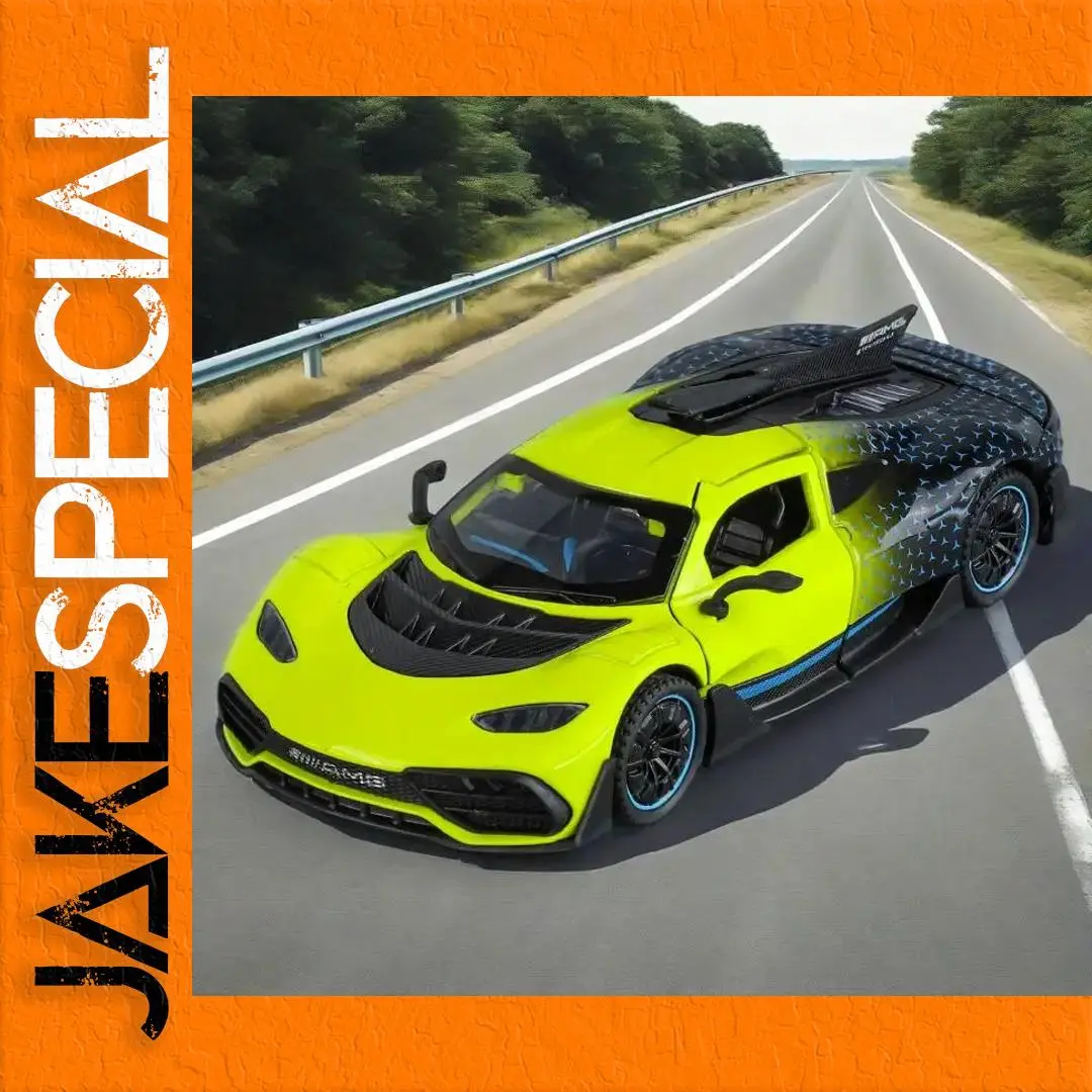 The 1:32 scale AMG ONE supercar model captivates with its vibrant design and intricate details. Finished in striking bright green with bold black accents, including a sleek black hood with air intakes and a sporty rear wing, this model showcases the high-performance essence of supercars. The addition of a blue stripe along the body and a fading pattern of blue triangles adds flair and sophistication. With realistic headlights and finely detailed multi-spoke wheels featuring black rims and blue highlights, this alloy model is ideal for car enthusiasts and collectors alike.