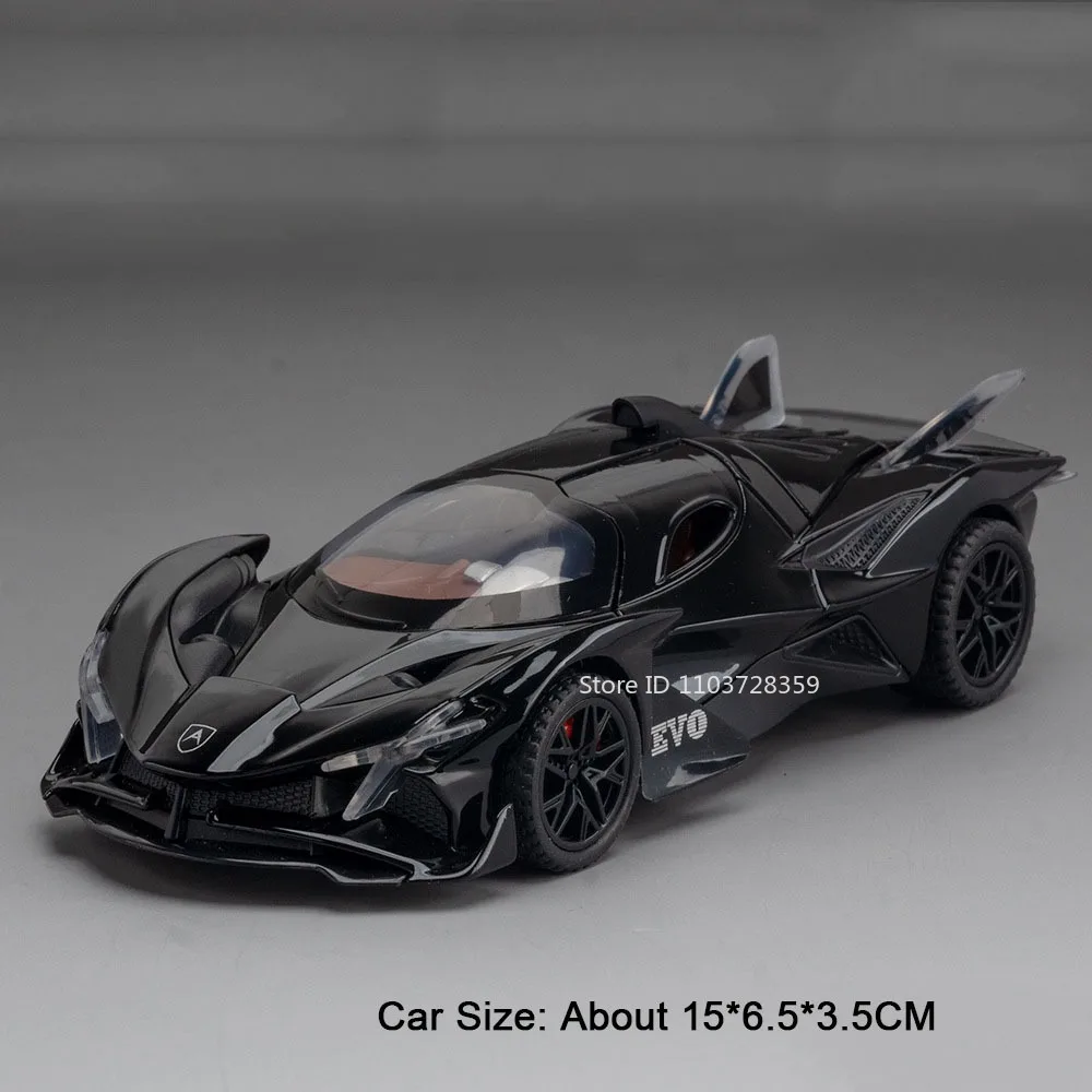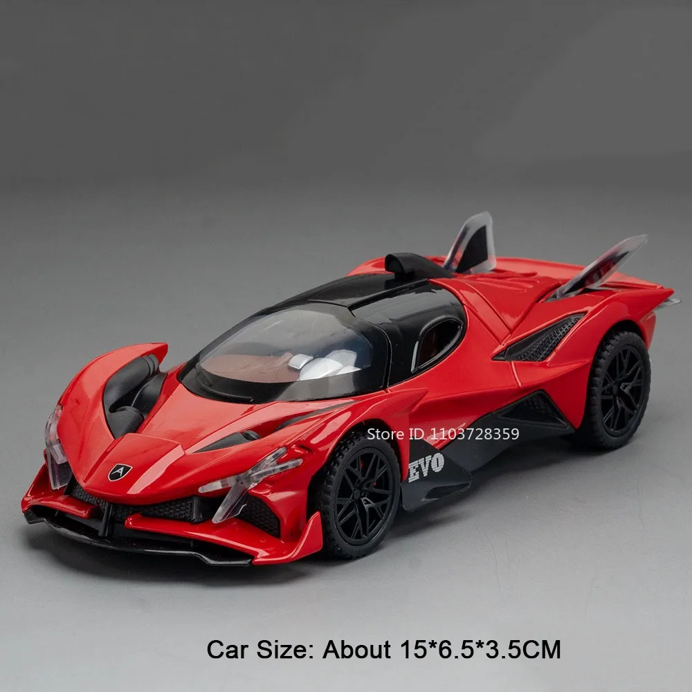 This detailed 1:32 scale model sports car features a durable alloy body, plastic chassis, and rubber tires, measuring approximately 15 x 6 x 3.5 cm for the Apollo IE EVO version and 15 x 6.5 x 3.5 cm for the EVO version. It offers realistic sound and light effects activated by pressing the front wheels, with functional doors, engine hood, and trunk that can be opened for an immersive experience. The pull-back mechanism allows the car to move forward automatically when pulled back. Available in vibrant colors such as EVO Black, EVO Orange, EVO Purple, EVO Red, IE Black, IE Purple, IE Red, and IE White, this high-simulation model is perfect for enthusiasts and collectors aged 14 and above.