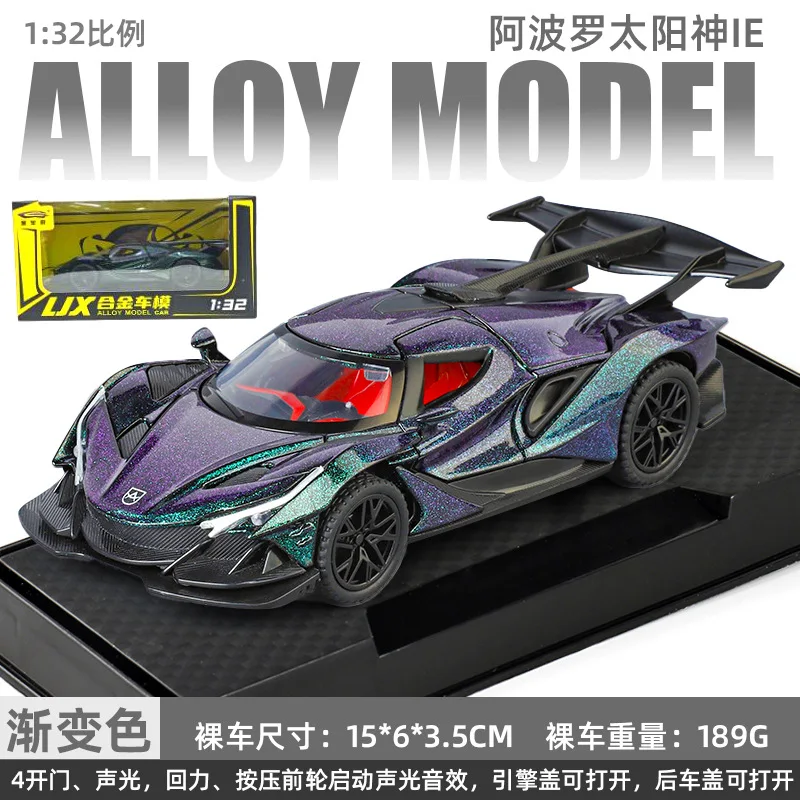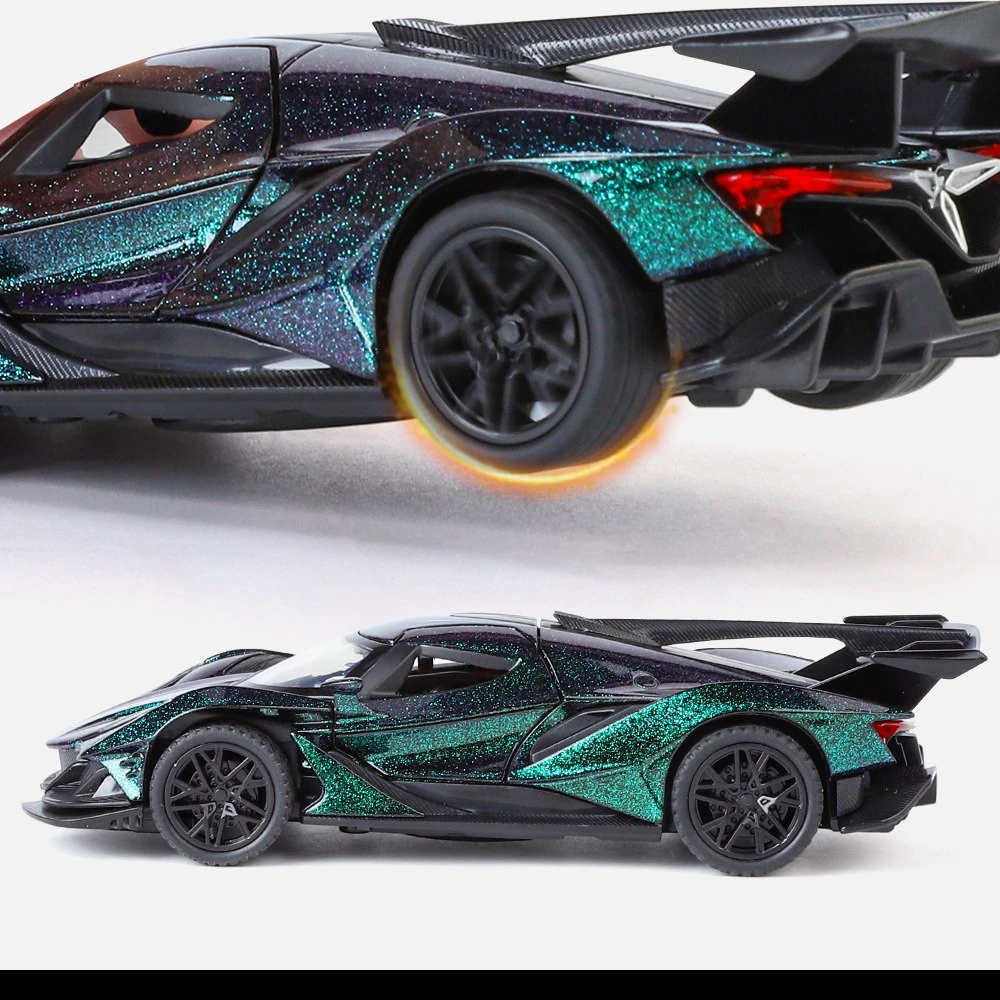 Immerse yourself in the luxurious world of high-performance cars with this meticulously crafted 1:32 scale diecast model of the Apollo IE Super Car. Made from durable metal, it boasts a glossy, glittery finish that highlights a sleek, aerodynamic silhouette. The dark, shimmering exterior features an iridescent sparkle effect, giving it a futuristic and sophisticated appearance. The sharply contoured lines, low-profile stance, and racing-inspired details such as an upward-opening wing and rear spoiler capture the essence of the real Apollo IE. The transparent plastic windshield offers a glimpse into the detailed red interior with simulated seats, creating a dynamic contrast. Functional sound and light features enhance its display value, making it a captivating centerpiece for enthusiasts and collectors alike.