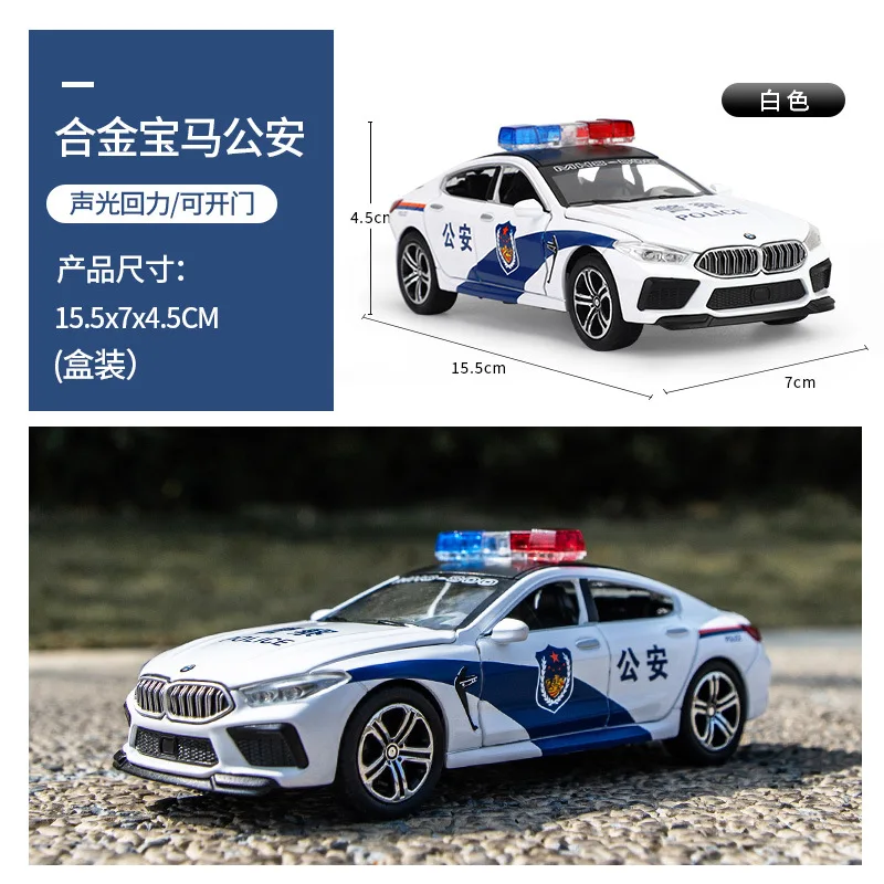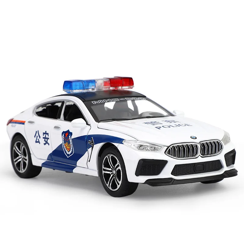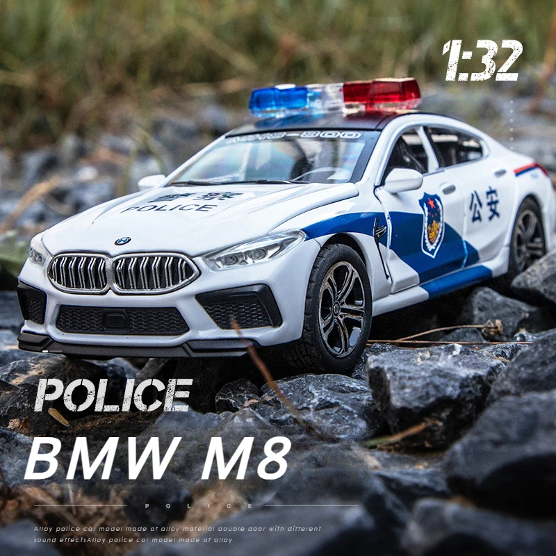 Experience the thrill of owning this highly detailed 1:32 scale diecast BMW M8 police car, perfect for collectors and enthusiasts alike. Crafted from durable metal, this model showcases a sleek, realistic appearance with a striking white body accented by vibrant blue and black police decals. The front grille features vertical slats closely resembling the authentic BMW design, complemented by detailed headlamps with clear lenses. The roof sports a vivid red and blue emergency light bar, which includes light and sound functions for added realism. Accurately positioned side mirrors, textured rubber tires, and a streamlined rear spoiler complete the dynamic, authentic look. Ideal for display or imaginative play, this model captures the essence of real police vehicles with incredible finesse.