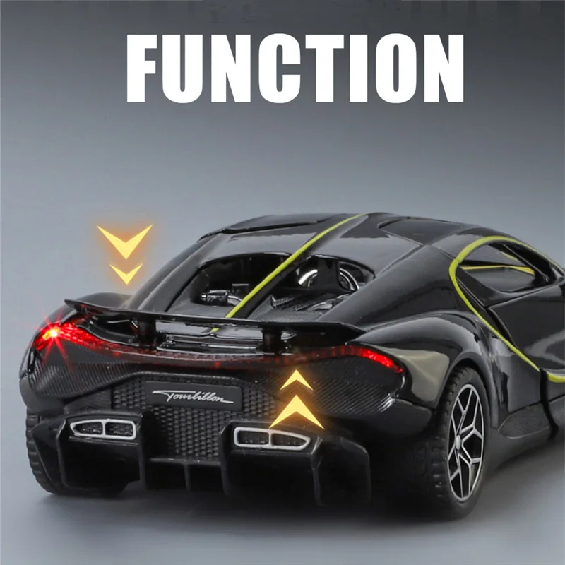Experience the thrill of owning this highly detailed 1:32 scale diecast alloy model of the iconic Bugatti Chiron, available in stunning black, vibrant blue, or luxurious gold finishes. Crafted from premium alloy and plastic, this model captures the sleek, aerodynamic design with smooth curves, sharp lines, and intricate details that emulate the high-performance luxury car. With sound and light simulation features, it brings realism and excitement to your display or collection. The gull-wing doors open to reveal a finely detailed interior and mechanical components, while the multi-spoke wheels and rear spoiler highlight its sporty character. Perfect for collectors or as a striking gift for automotive enthusiasts, this model elevates any space with its craftsmanship and dynamic aesthetic.