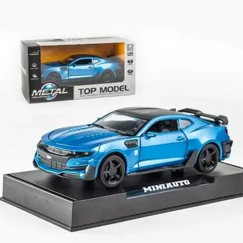 Experience the thrill of owning this detailed 1:32 scale Camaro diecast model, crafted from durable metal alloy. With realistic sound and lighting effects, this model captures the essence of the iconic Chevrolet Camaro. Its authentic design features sharply contoured surfaces, aerodynamic styling, and a glossy finish in vibrant colors like white, metallic blue, bright yellow, vivid red, and matte black. The open hood reveal intricately detailed engine compartments, adding a powerful touch for collectors and enthusiasts alike. Perfect for display, this model embodies speed, precision, and modern aesthetic. Whether you want to enhance your collection or gift a striking piece, this Camaro model combines style and realism in one superior package.