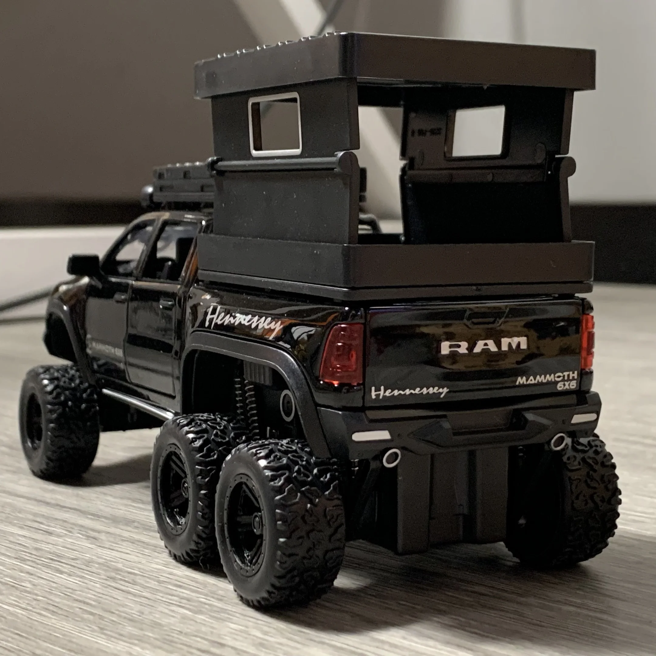 - Includes realistic design details such as textured grille with “RAM” logo, hood scoop, black side mirrors, and black off-road tires with deep treads on black rims.