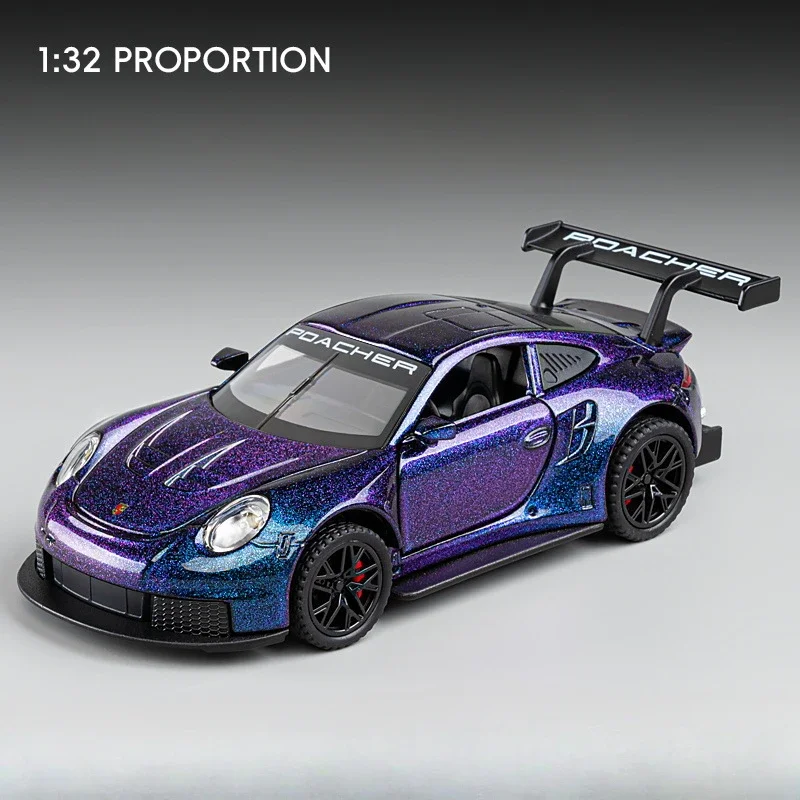 Experience the thrill of high-performance racing with this meticulously crafted 1:32 diecast GT3 RS toy car. Its sleek, aerodynamic design captures the excitement of real racing cars, featuring flowing lines and detailed accents that highlight speed and agility. The glossy black finish with a sparkling surface adds a premium feel, while the blue and purple variants provide elegant alternatives. With openable doors, realistic sound and light effects, and a pull-back motor, this model combines aesthetic appeal with interactive fun. Perfect for collectors and children aged 14 and above, it offers durable construction and precise detailing, making it a standout addition to any racing collection or display case.