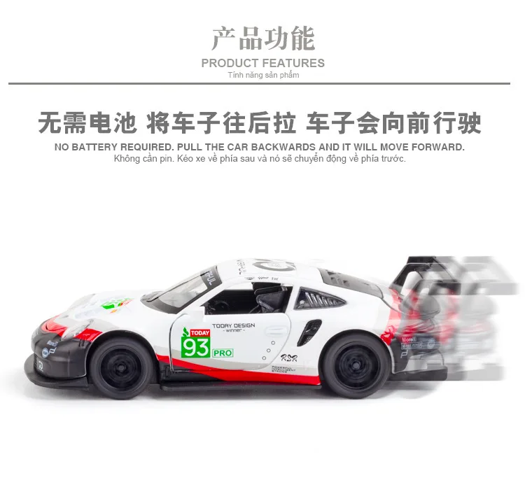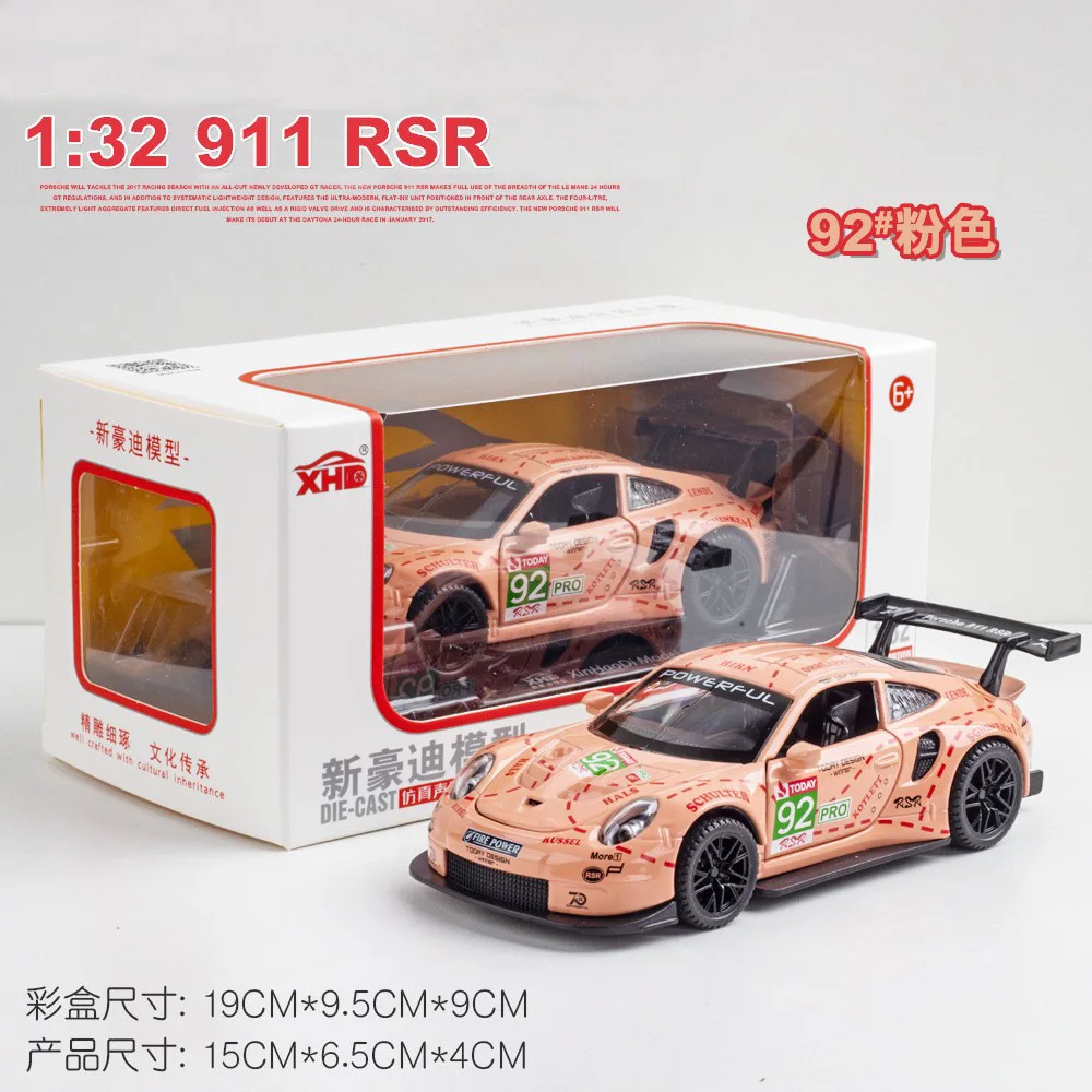 Imagine owning a meticulously crafted replica of the legendary Porsche 911 RSR. Measuring approximately 48 centimeters long, this diecast alloy model embodies sleek racing design with its aerodynamic silhouette and sharp contours. Finished in a soft pink hue complemented by vibrant decals and sponsor stickers, it captures the essence of high-performance racing vehicles. The detailed exterior includes realistic headlights, grille, vents, and a prominent rear wing mounted on black supports, enhancing its authentic look. Durable alloy construction ensures a polished finish, highlighting craftsmanship and attention to detail. Perfect for display and collection, this model adds a touch of racing passion to any space. Whether as a gift or personal keepsake, it symbolizes style, speed, and precision.