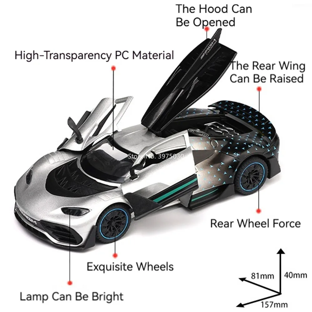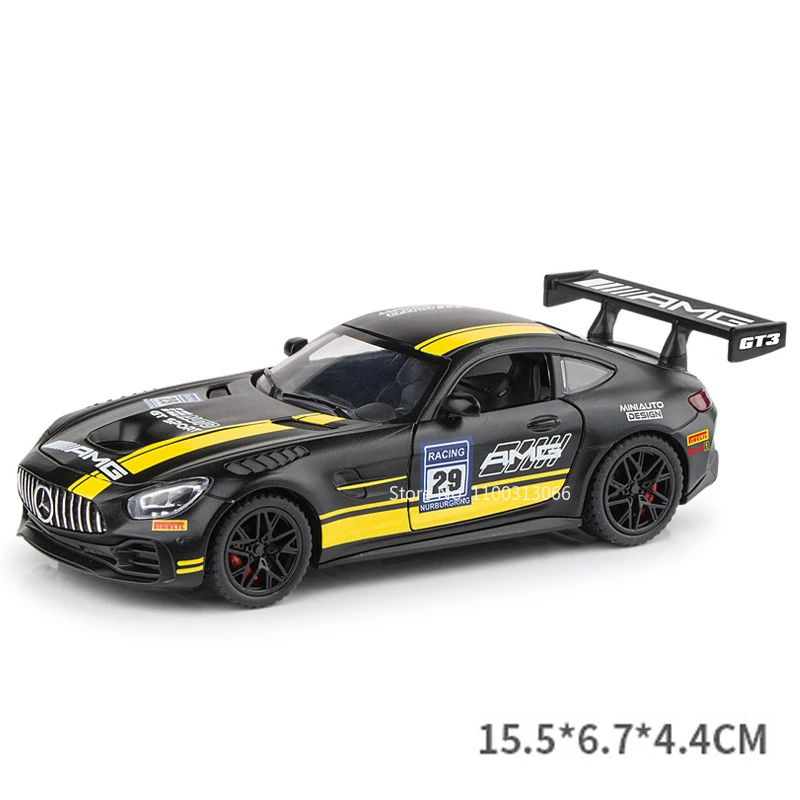 This 1:32 scale diecast toy car features a zinc metal body, plastic chassis, and rubber tires, measuring approximately 15.7 x 8.1 x 4 cm. Available in vivid colors like bright black, matte black, green, purple, and silver, it boasts realistic details, including opening doors, sound and light effects, a pull-back mechanism, and exceptional durability. The range includes GT3 models (about 15.5 x 6.7 x 4.4 cm), GTR models (about 15.5 x 6.7 x 4.4 cm), and a GTR police car (about 15 x 6.7 x 5 cm). A perfect collectible for enthusiasts seeking a high-performance, visually striking miniature replica.