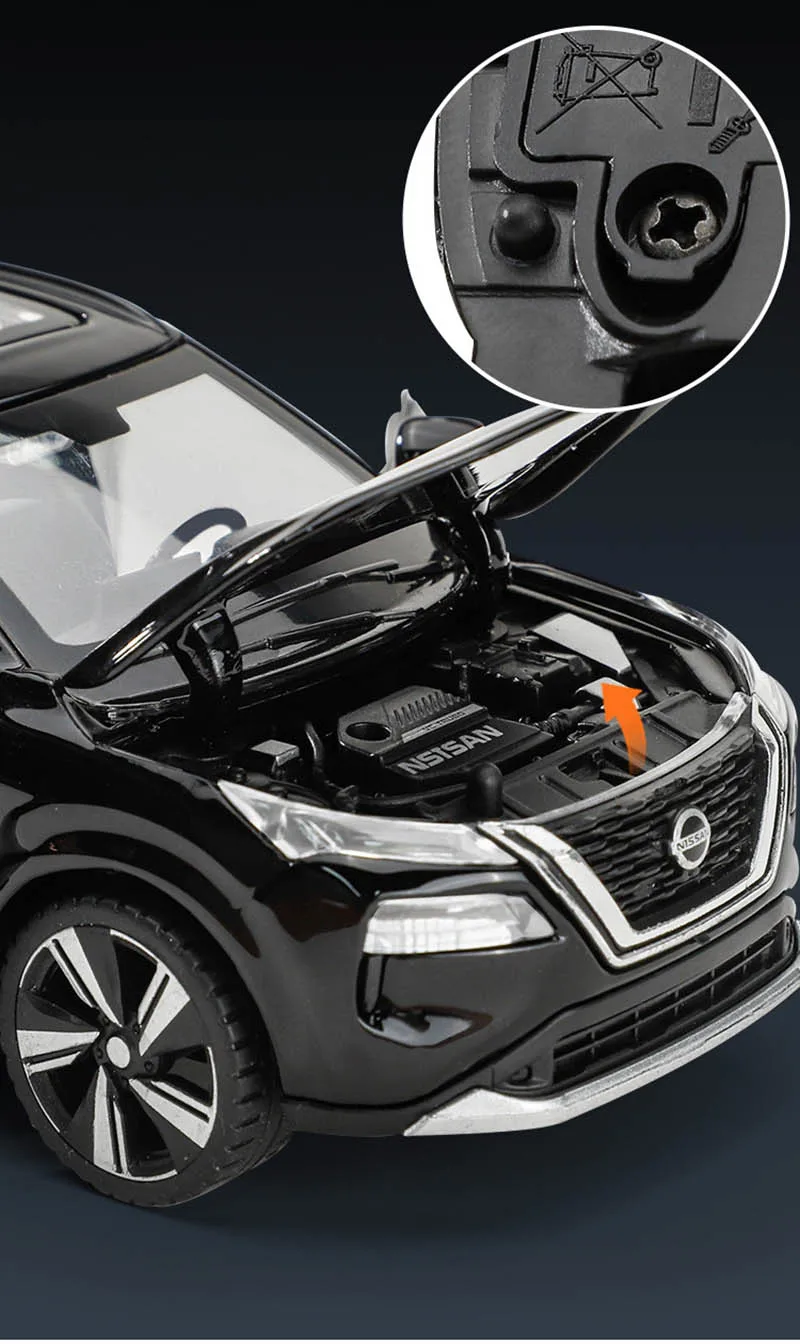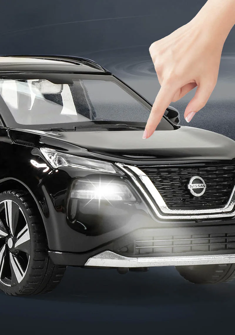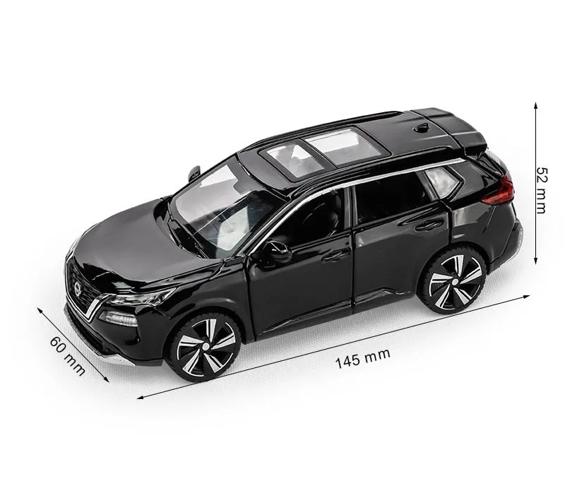 The 1:32 Diecast X-TRAIL SUV Alloy Metal Model Toy Car is an exquisite replica that combines sleek aesthetics with engaging features. With its glossy black finish and meticulously designed chrome grille, it captures the essence of a modern SUV. The detailed headlights, complete with silver accents, give it a distinctive look while the six-spoke alloy wheels enhance its sporty presence. The model stands at an impressive 14.5 cm long, 6 cm wide, and 5.2 cm high, allowing you to display it proudly in any collection. Enhanced with simulation sound and light effects, this diecast model is not just visually appealing but also brings a realistic touch to playtime or display.