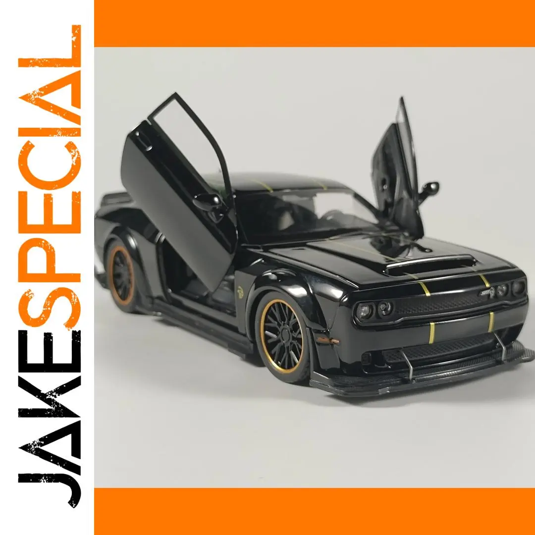 Experience the thrill of owning this intricately crafted 1:32 scale diecast model of the Dodge Challenger SRT Hellcat Redeye Super Sports Car. With its sleek, glossy black finish and striking yellow pinstripes along the center, this model captures the aggressive and sporty essence of the real vehicle. The gull-wing doors lift upward, adding a futuristic touch, while the detailed grille, dual round headlights, and side vents emphasize its bold design. The multi-spoked wheels with a contrasting gold outer ring elevate its aesthetic appeal. Made primarily of high-quality metal, this model features sound and light functionality, making it a captivating display or collectible item for enthusiasts. Its realistic textures and precise details reflect craftsmanship and attention to detail, perfect for those who appreciate automotive artistry.