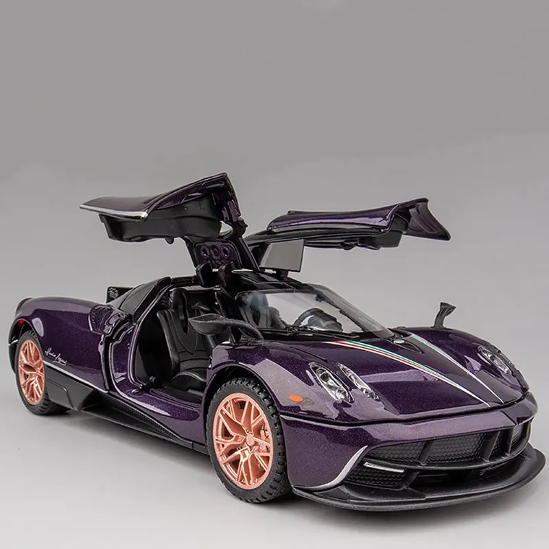 Step into the world of luxury racing with this meticulously crafted 1:32 scale Huayra Dinastia alloy model. Its sleek, aerodynamic silhouette is finished in a deep purple metallic hue that shimmers with elegance, making it an eye-catching display piece. The smooth, sculpted surfaces highlight precise design elements like a prominent front splitter and a sporty rear spoiler, embodying high-performance aesthetics. The gull-wing style doors open to reveal a detailed interior, adding an interactive element to your collection. Equipped with pull-back functionality, realistic sound, and light features, this model combines beauty and entertainment. Made from durable alloy and plastic, it offers a realistic weight feel and lasting quality for enthusiasts and collectors alike.