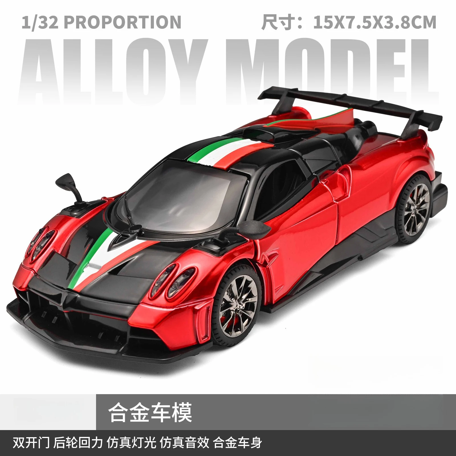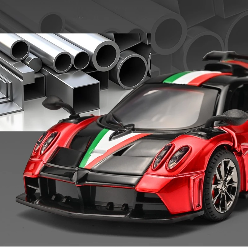 Experience the thrill of owning a meticulously crafted 1:32 scale diecast model of the Huayra Imola supercar. This premium collectible captures the sleek, aerodynamic silhouette and dynamic color contrasts that make the original so iconic. The model features a vibrant red body accented with black elements along the sides, roof, and rear, complemented by a striking racing stripe in green, white, and red running centrally from front to back. Equipped with realistic details like clear headlights, side mirrors, and a large rear wing spoiler, it exudes a high-performance look. The alloy construction ensures durability and a premium feel, perfect for display or as a gift for car enthusiasts and collectors aged 14 and above.