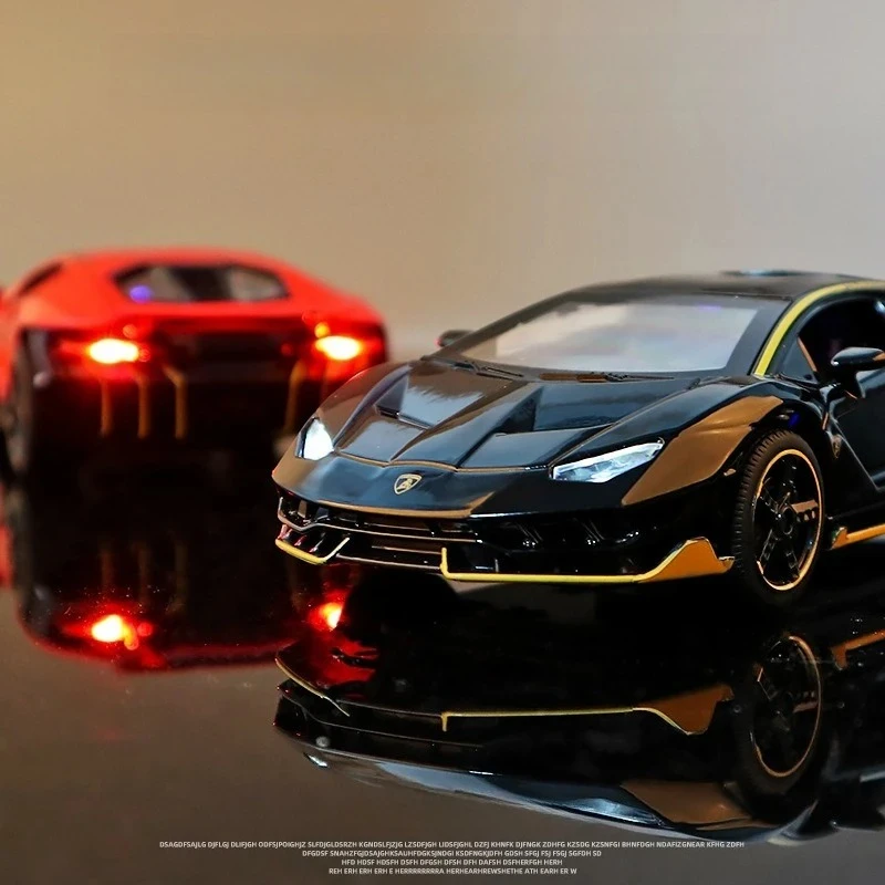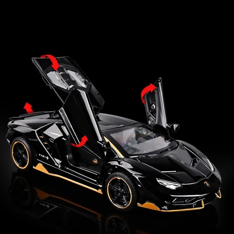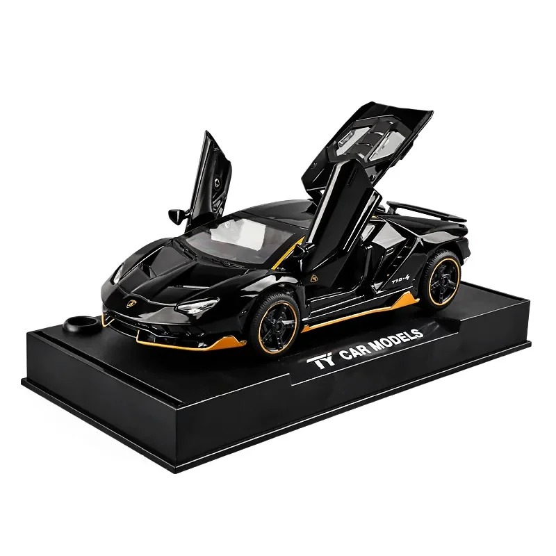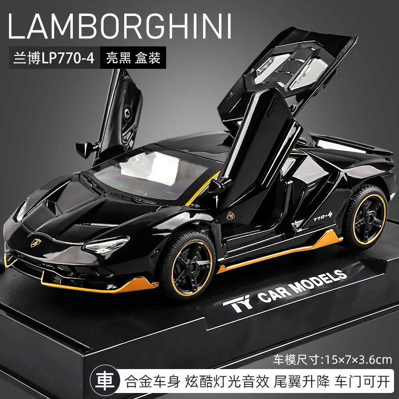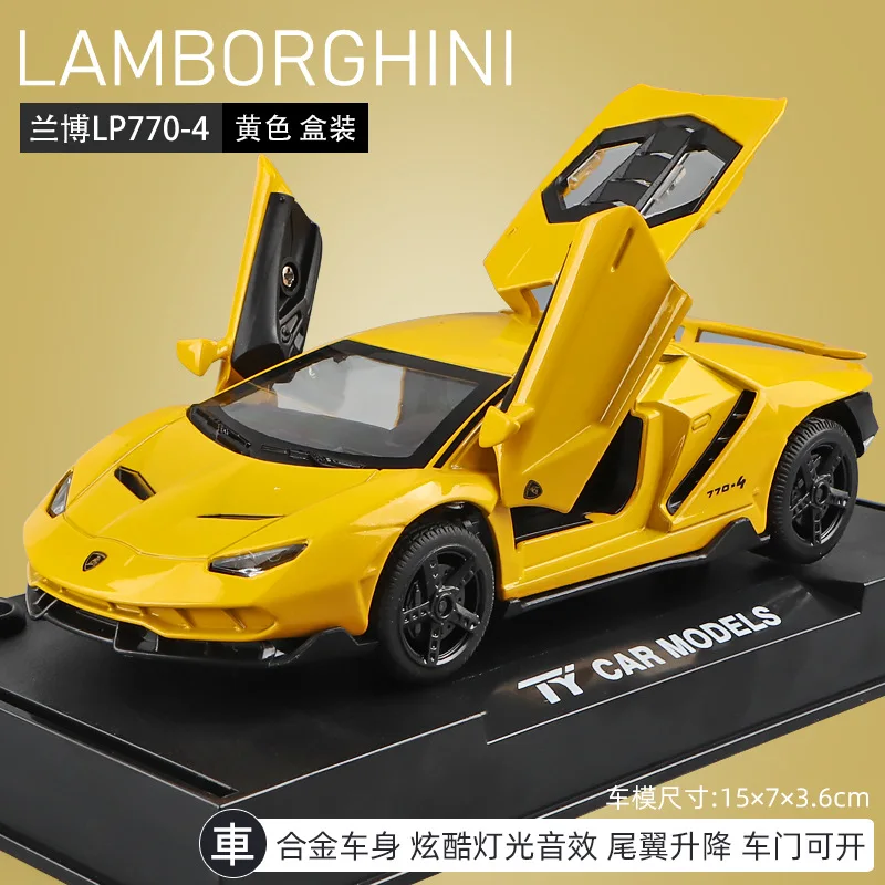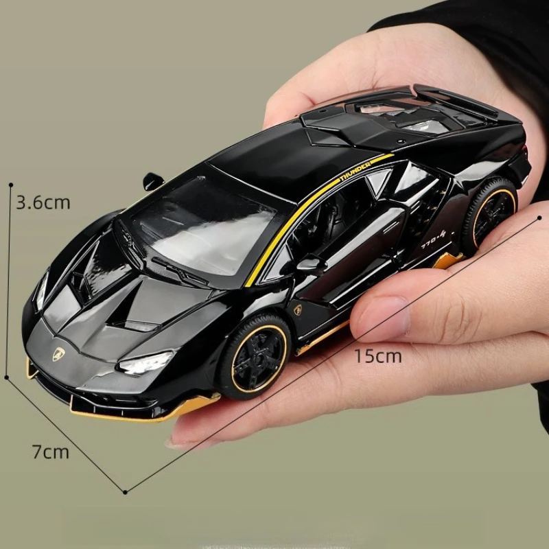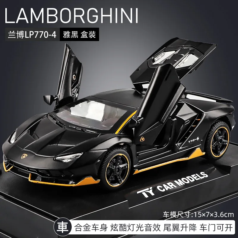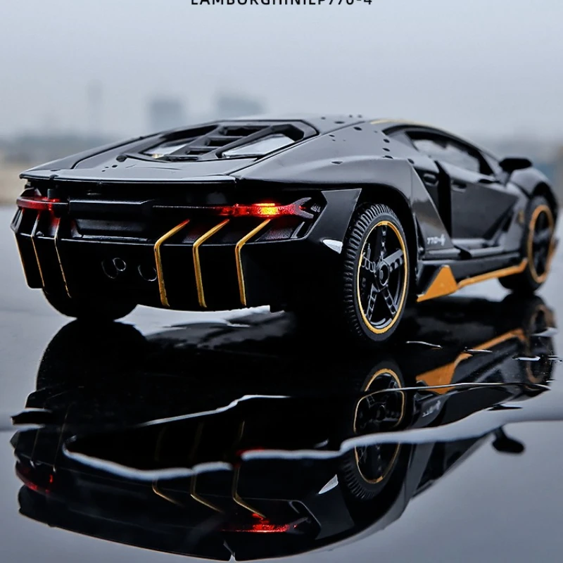 This stunning 1:32 scale diecast model of the Lamborghini Centenario LP770-4 captures the essence of the original supercar with its sleek high-gloss black finish paired with vibrant yellow accents. The aerodynamic silhouette features sharp lines that showcase the car's sporty design, while the multi-spoke wheels enhance its striking appearance. Crafted from metal, this model offers both durability and a realistic feel. With sound and light effects powered by a button battery, it brings the experience of the Centenario to life. Ideal for collectors, automotive enthusiasts, or as a remarkable gift, this model truly embodies the spirit of luxury performance.