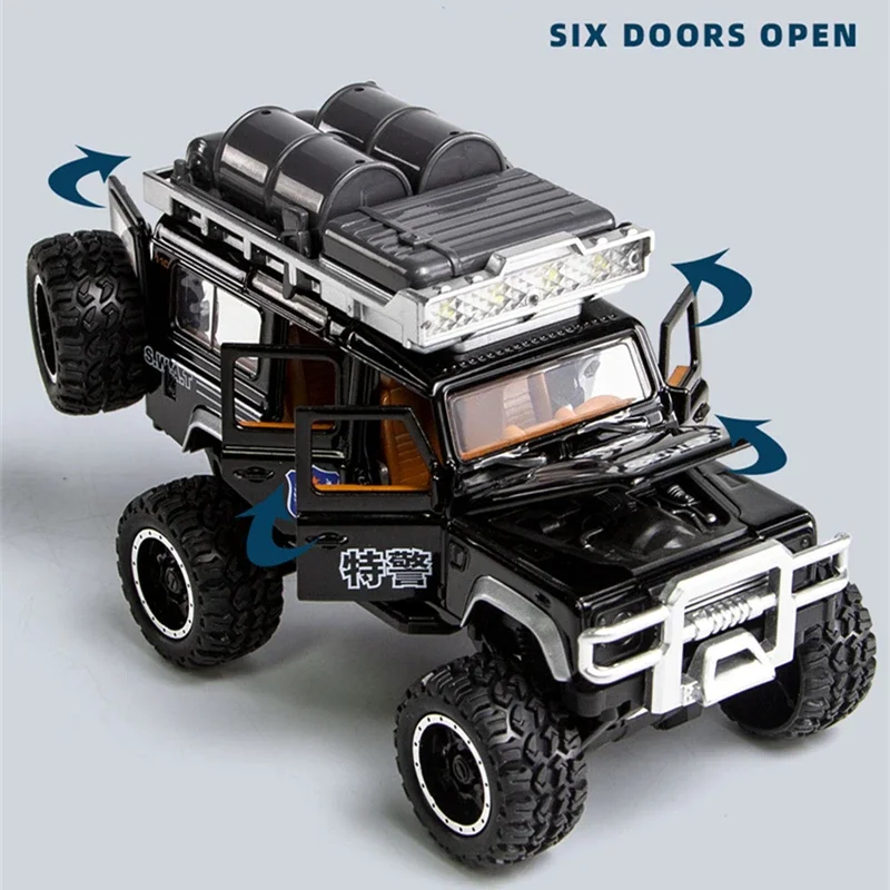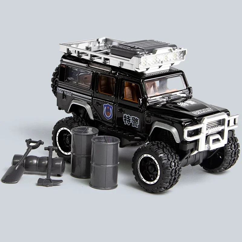 Experience the rugged realism of this 1:32 scale diecast Land Rover Defender police vehicle model, crafted from alloy and plastic. Featuring a striking contrast of white body and black roof accents, it includes detailed police insignia, a vibrant red and blue light bar with sound and light functions, and textured off-road tires with matching wheel arches. This collectible toy is designed for adult enthusiasts, showcasing precise detailing with transparent windows revealing an interior with molded seats and steering wheel. Non-electric and battery-free, this model is perfect for display or collection, combining durability and authentic aesthetics in a compact, highly detailed size.